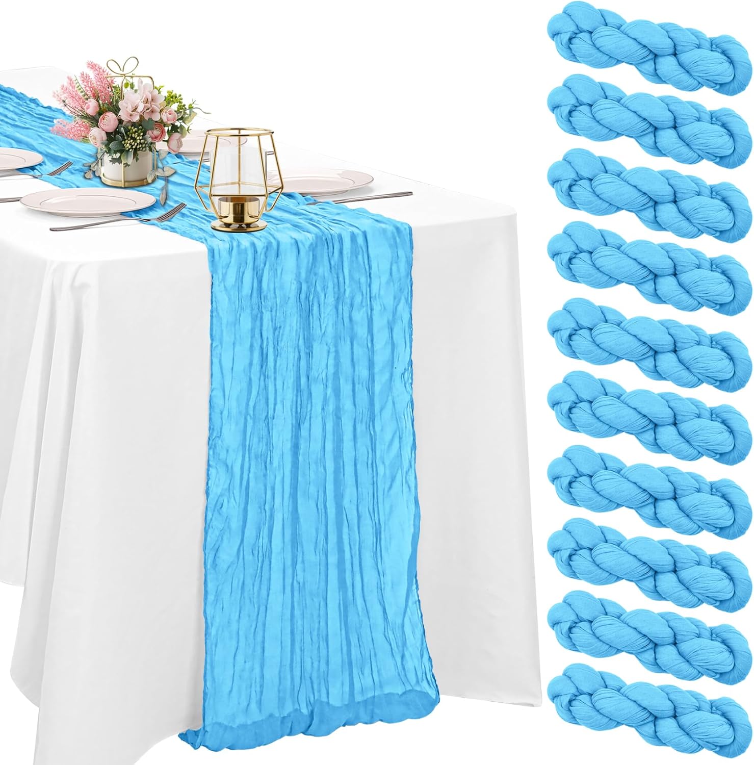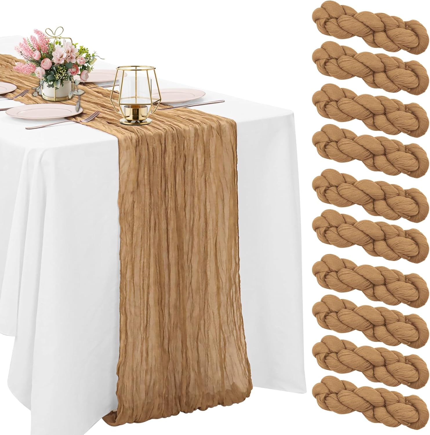 Gauze Boho Rustic Cheesecloth Table Runner Feature: 1.Cheesecloth table runner has a soft and smooth touch, and high-quality polyester is more lightweight and durable, which can be used for a long time. 2.10 pcs 10FT table runner can decorate tables for 10-12 people, while 6FT table flags can decorate tables for 4-6 people. Sufficient length can match different effects, you can naturally hammer it onto the floor or elegantly place it on the table, and different decorations give you different experiences. 3.Multiple usage methods: Boho wedding table decorations can be used not only to decorate your table, but also to decorate chairs, or as curtains. It can also be paired with wedding arches stand, backdrop panels, etc. to create a different effect. Specification: Quantity: 10 pieces Size: Length: 120inch Width: 20inch Color: As Picture Show Style: Bohemian style, retro style Material: polyester Tip: 1. Manual measurement, please allow for slight errors 2. Due to differences in brightness and screen, please allow for slight color differences
