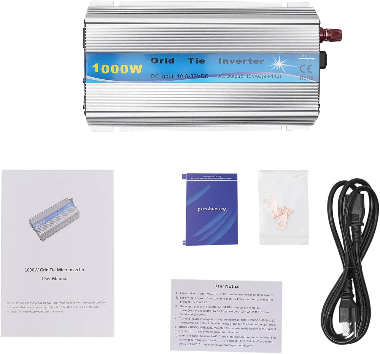 ApplicationIt is very suitable for grid-connected power generation in schools, power stations and households. It is applicable to 18V solar panel and 24V battery.Specification Color: SilverModel: GTI1000WMaterial: Aluminium AlloyAC Output Power:1000WMaximum AC Output Power:1050WAC Output Voltage: 110V(AC 90V-140V)DC Input: DC10.8V-32VFrequency Range: 48- 62Hz(Self-adaption)MPPT Range 15.5-22VScope of Application: 18V Solar Panel and 24V BatteryPackage Size: 35*20*10cm/13.8*7.9*3.9inProduct Size: 21*16.5*5.3cm/10.6*6.5*2.1inGross Weight: 4kg/8.8lbsNet Weight: 3.5kg/7.7lbsPackage Included1*Grid Tie Inverter1 Set* English Manual1*Warranty Card1*Power CordAll Accessories for Assembly