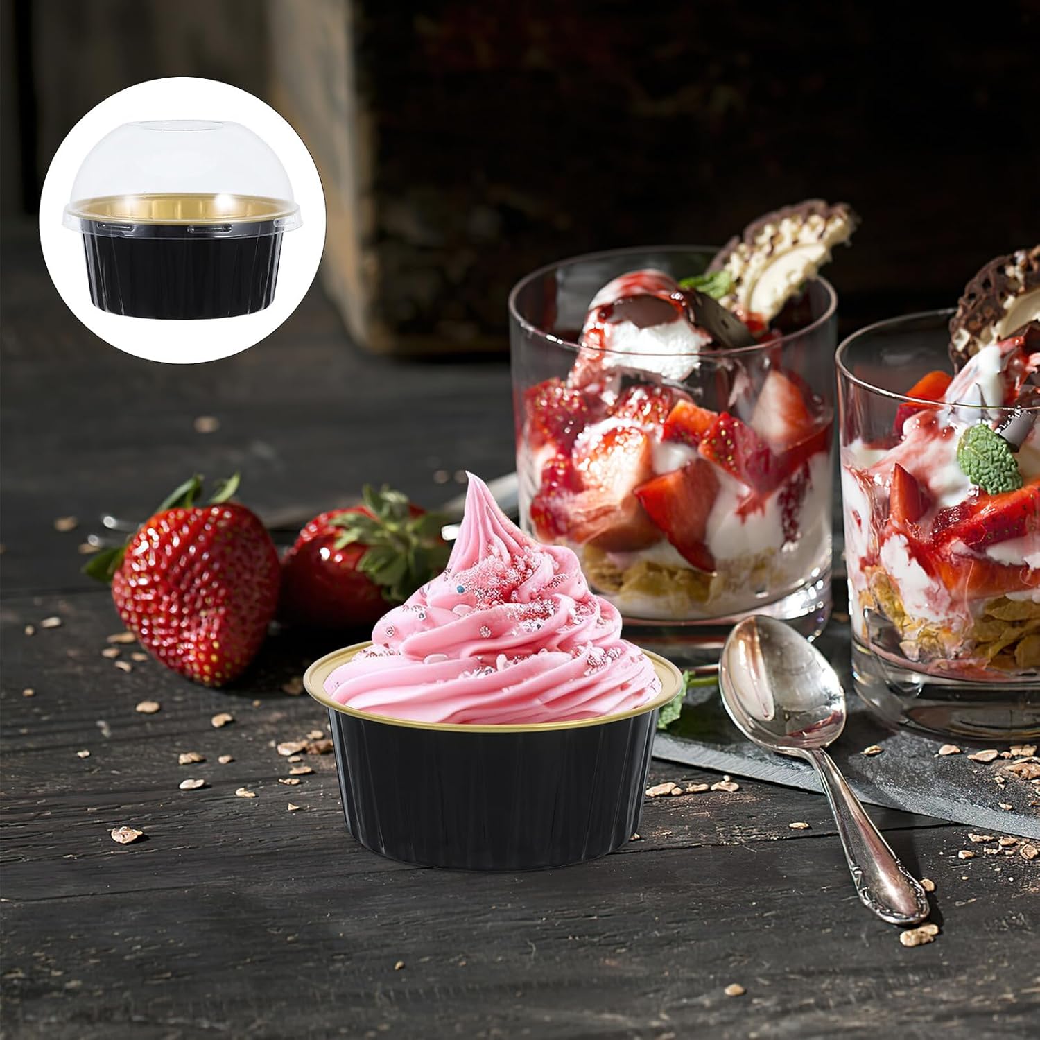 Package Include 100 x cake tin cup Features -Multipurpose use: great for creating a variety of mini desserts such as mini bread, brownies, and puddings, these cups are a versatile addition to your baking tools individual cake pans. -Ideal for events: these cups are great for use at family gatherings, parties, and celebrations, providing a convenient and stylish way to serve your treats aluminum cake pans with lids -Material:Aluminum foil, plastic disposable dessert bowl -Product Info:Cake tin foil cup -Size:8.40X8.40X6.00cm/3.30X3.30X2.36in mini baking cups with lid -Elegant presentation: the attractive design of these cups enhances the visual appeal of your desserts, making them look professionally made foil muffin tins with lids. -Oven and microwave safe: these aluminum foil cups are designed to withstand high temperatures, making them suitable for both oven and microwave use. remember, the plastic lids should not be heated mini cheesecake pans with. -Color:Black mini cheesecake cups -Portable and storable: the included lids make it easy to transport and store your baked goods, keeping them fresh and protected disposable tin foil paper cup.Goods Descriptionbaking tins with lids Their high-temperature resistance makes them suitable for oven use, allowing you to bake delicious puddings and other desserts directly in the cups.baking cups These aluminum foil cups with lids are tools for any kitchen.appetizer cups Whether you're hosting a party or simply preparing treats for your family, these cups are a practical and stylish choice.foil muffin tins The 125ml size is great for single servings, and the lids make storage and transportation a breeze