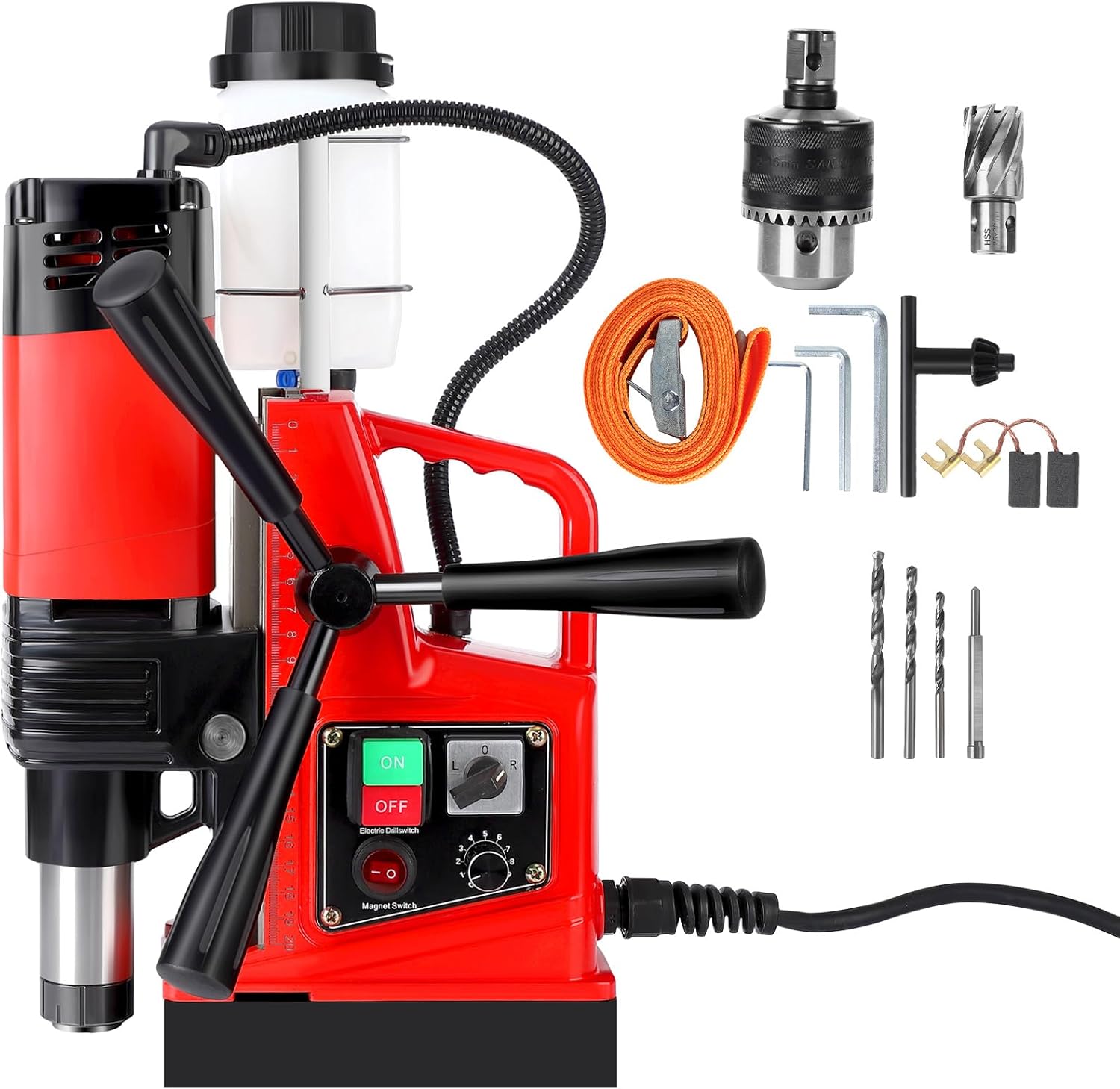 **1100W Portable Magnetic Drill – Unleash Your Drilling Power!**Transform your drilling experience with our 1100W Portable Magnetic Drill, designed for both industrial applications and home improvement projects. With a robust 550 RPM and a 1.6-inch boring diameter, this drill is engineered to tackle tough jobs with precision and ease. Whether you’re a professional tradesman or a DIY enthusiast, this versatile tool is your go-to solution for all your drilling needs.**Key Features:**- **Powerful Performance:** Equipped with a 1100W motor, this magnetic drill delivers exceptional power for efficient drilling in various materials.- **High Speed:** Achieve optimal drilling speed with 550 RPM, ensuring quick and effective results on every project.- **Versatile Boring Diameter:** Drill up to 1.6 inches in diameter, making it perfect for a wide range of applications, from metalworking to construction.- **Portable Design:** Lightweight and compact, this magnetic drill is easy to transport, allowing you to take it wherever your projects you.- **Complete Set:** Comes with 11 precision drill bits, providing you with the tools you need to get started right away.- **Magnetic Base:** The strong magnetic base ensures stability and safety during operation, allowing for hands-free drilling on vertical and overhead surfaces.- **User-Friendly:** Simple controls and an ergonomic design make this drill easy to use, even for beginners.**Why Choose Our Portable Magnetic Drill?**- **Durability:** Built to withstand the rigors of industrial use, this drill is made from high-quality materials for long-lasting performance.- **Versatility:** Ideal for both professional and home improvement projects, this drill is perfect for metal, wood, and other materials.- **Enhanced Safety Features:** Designed with user safety in mind, our magnetic drill includes features that minimize the risk of accidents during operation.