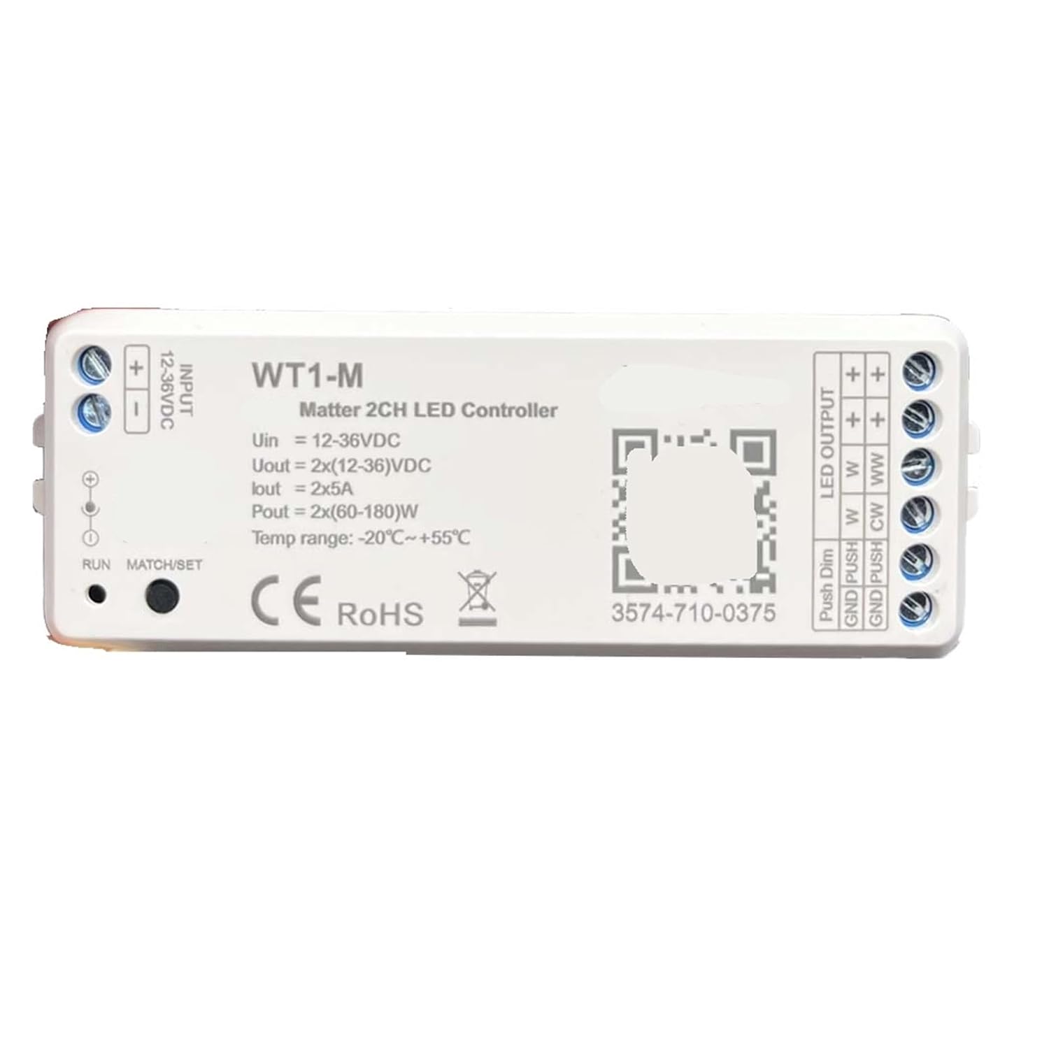 Outlet & Switch CombosTechnical parameters:---Input voltage: 12-36VDC---Output voltage: 2×(12-36)VDC---Output current: 2CH, 5A/CH---Output power: 2 x (60-180)W---Output type: constant voltage---Operating temperature: Ta: -20℃~+55℃---Case temperature (maximum): Tc: +85---Control distance: 30m (barrier-free space)---Dimming range: 0-100%---PWM frequency: 2000Hz (default)Model: WT1-MCertification: CCC, CE, CQC, GS, ULMaterial: ABSOrigin: Mainland ChinaProduct Type: DimmerProduct Type: WT1-M ControllerLED chip: Monochrome/CCTControl method: /remote control/voiceUse with: LED Dimmer Remote ControlFeature 1: Dimmable colorFeature 2: Remote controlFeature 3: Dimming 3000k-6500kFeature 4: Single color/two colors