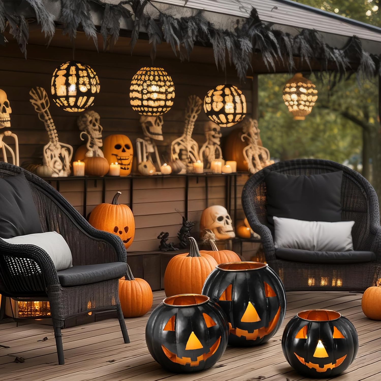 Features: Complete Halloween set: Three metal Jack-O-Lanterns in varying sizes plus a 60 x 30 inch creepy cloth for versatile decorating. Battery operated LED lights create a spooky glow without cords. Durable and authentic: Rustic iron construction withstands outdoor elements, while intricately carved faces deliver classic Halloween charm. Nests for compact storage. Specifications: Material: iron Color: black, orange Size: Large Lanterns: 12.01 x 10.63 inches/ 30.5 x 27 cm Medium Lanterns: 9.45 x 8.66 inches/ 24 x 22 cm Small Lanterns: 7.09 x 5.91 inches/ 18 x 15 cm Package includes: 3x Lanterns 1x Black creepy cloth 3x LED candles (batteries not included) Notes: Manual measurement, please allow slight errors on size. The color may exist a slight difference due to different screen displays.