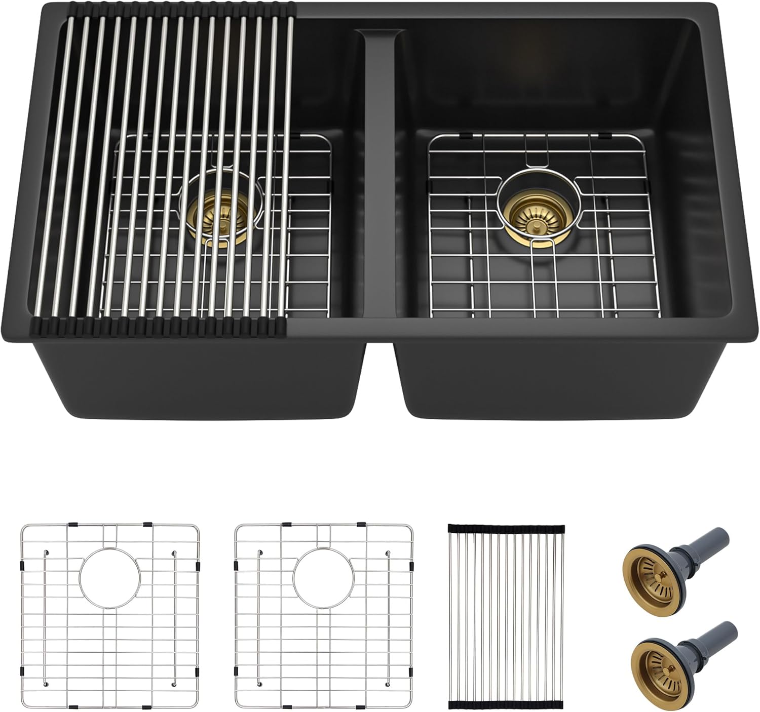 | Included Components | 33 inch double-bowl granite composite sink, bottom rinse grid×2, gold drain assembly with cover×2, roll up drying rack |