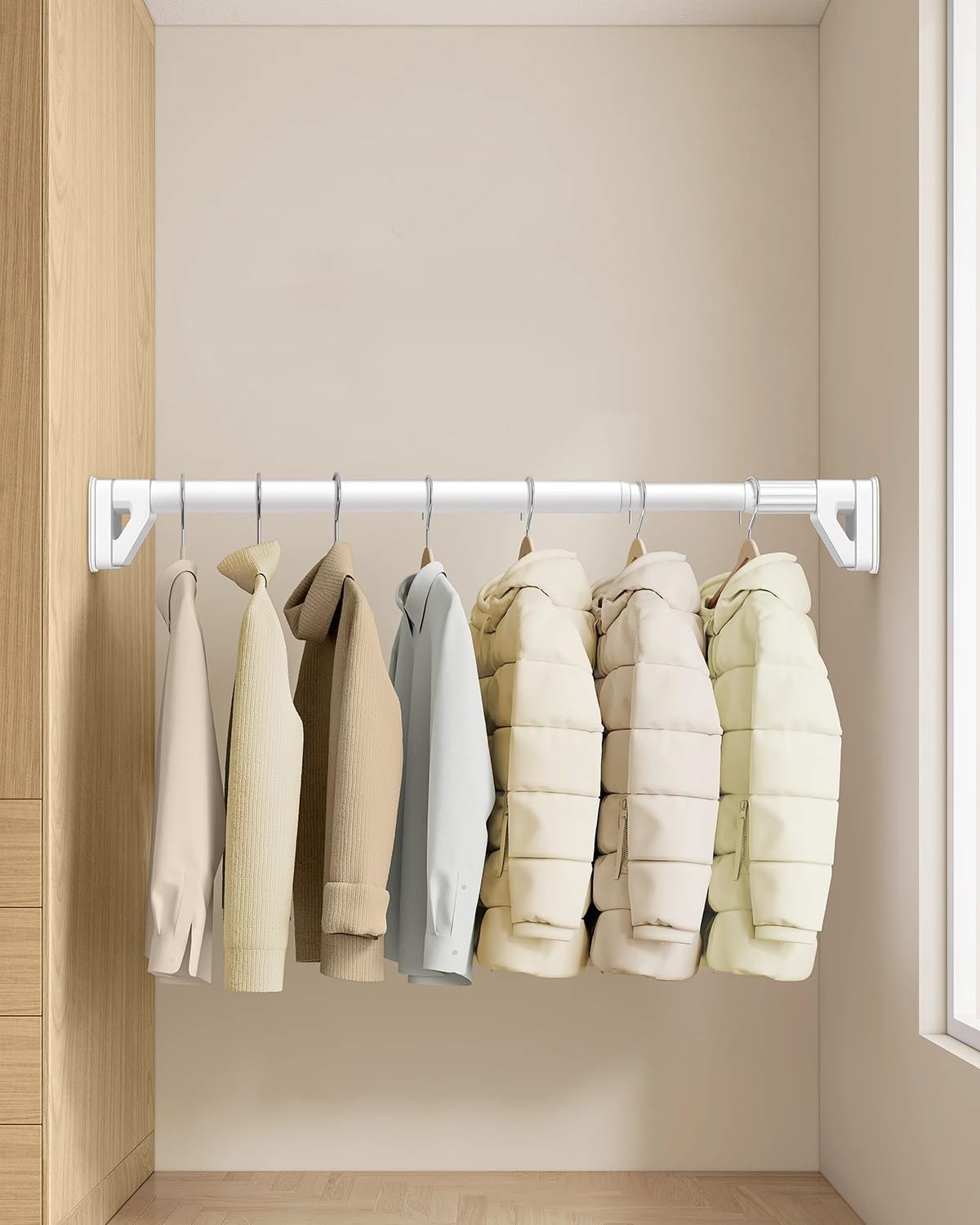 Closet Rod Top Mount Wardrobe Bars:Introducing our Closet Rods for hanging clothes, the perfect storage solution for anyone looking to enhance their wardrobe organization while maintaining a sleek aesthetic. Designed for versatility, these rods are ideal for maximizing space in both small and large closets, bringing functionality and style to your home. **Package Includes** 1 x Closet Rod 2 x Holders **Specifications** Material: Durable Stainless Steel Color Options: Black, White Aluminum Alloy Thickness: 0.6mm Base Dimensions: 6cm x 9cm (2 3/8" x 3 1/2") Pole Diameter: 3.3cm (1 1/4") Adjustable Length: 50cm - 220cm (19 3/4" - 86 5/8") Maximum Load Capacity: 230kg/500Lbs - 170kg/370Lbs Installation Type: Wall-mounted Mounting Method: No Drilling Customizable Length Available **Key Features** Elegant and robust design that complements any decor. Rust-resistant material ensures your clothes remain stain-free. Ideal for heavy garments like winter coats and suits. Simple assembly process allows for quick installation. Designed to withstand the weight of heavier items without bending. Extended rods provide flexible storage options while maintaining strength. Keeps your wardrobe organized and clutter-free, enhancing your daily routine. **Note** Please allow a 1-2 cm error due to manual measurements. We strive for accurate color representation; however, lighting and display settings may affect actual colors. **Customer Support** Committed to providing top-notch quality and service, we are here for you. If you have any inquiries regarding our products or your order, please contact us via email, and our team will respond within 24 hours.
