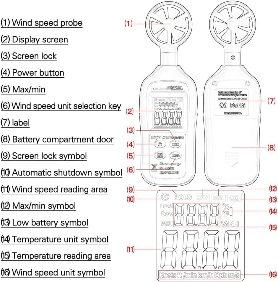 Specifications:Model: GN301Material: ABSColor: Black&GreenPower Supply: 3 * 1.5V AAA battery (NOT included)Wind Speed Range: 0.4~30.0m/s; 1.4~108km/h; 0.9~67.0MPH; 0.8~58.0knots; 80~5900ft/min Wind Speed Unit: m/s, km/h, MPH, knots, ft/minResolution: 0.1m/s; 0.1km/h; 0.1MPH; 0.1knots; 1.0ft/minAccuracy: ±(3%+0.3m/s); ±(3%+1.0km/h); ±(3%+0.4MPH); ±(3%+0.4knots); ±(3%+40ft/min)Temperature Range: -20~70°C; -4~158°FResolution: 0.1°C; 0.1°FAccuracy: ±1.5°C; ±2.7°FItem Size: Approx. 179.4*56*29.7mm / 7.06*2.2*1.17inItem Weight: Approx. 100g / 3.53ozPackage Size: Approx. 270*100*45mm / 10.63*3.94*1.77inPackage Weight: Approx. 155g / 5.47ozPacking List:1 * Digital Anemometer1 * Users Manual