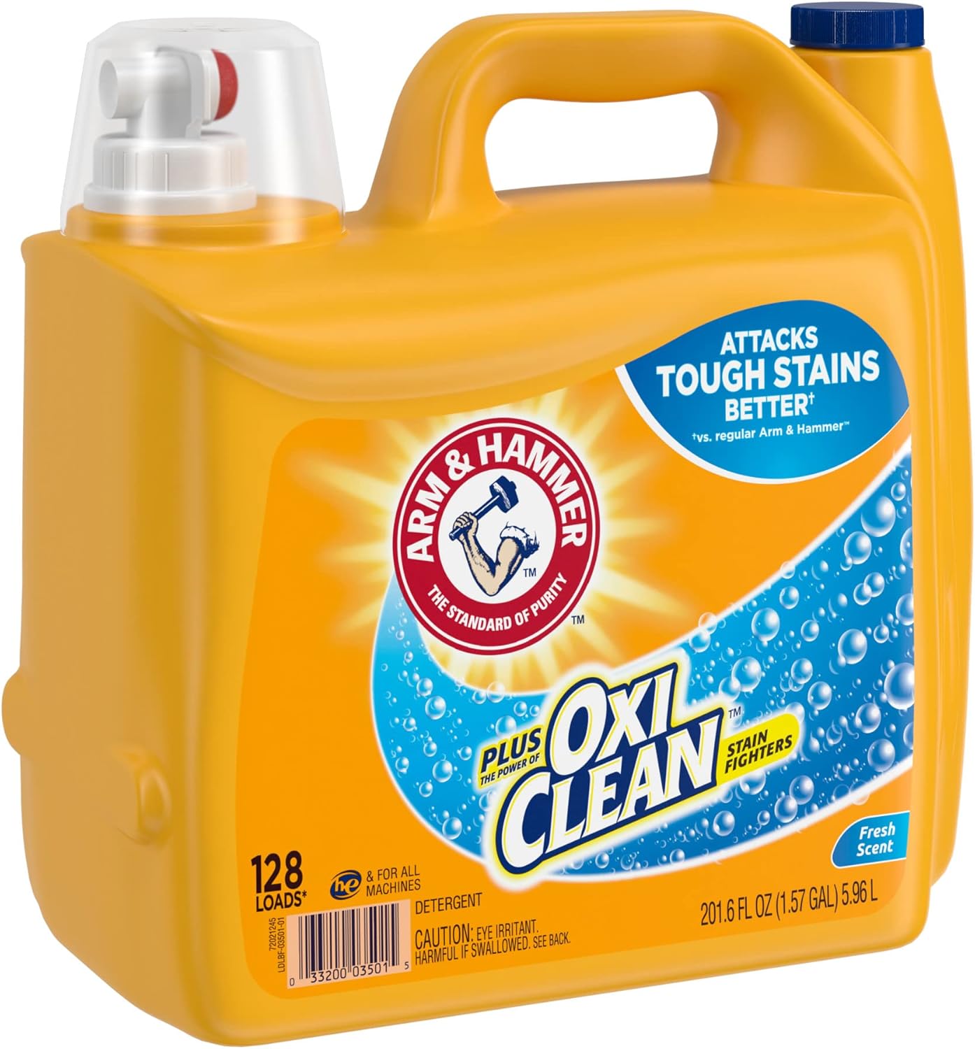 Value is a big deal when it comes to stain remover laundry detergent. ARM & HAMMER Plus OxiClean, Fresh Scent is concentrated with 2X powerful stain fighters in every drop vs. leading bargain detergent. This concentrated liquid laundry detergent with ARM & HAMMER freshness is supercharged with OxiClean Stain Fighters for effective stain lifting and whitening with a refreshing Fresh Scent. It’s a stain fighting laundry detergent you can rely on for the 5-in-1 power of a stain fighter, deep cleaner, whitener, brightener, and lasting freshness all in one bottle. This liquid washing detergent cleans over 101 tough stains, and whitens and brightens with a lasting fresh scent. It is a low-sudsing formula stain removal detergent that rinses clean and is designed to work in both standard machines and today's energy conscious High Efficiency (HE) models. That’s why this concentrated liquid stain remover laundry detergent is a smart choice for powering out odors and tough stains. Many of our laundry, cat litter, toothpastes and personal care products are made with ARM & HAMMER Baking Soda, delivering the quality you can count on, from the brand you trust. Versatile and affordable, for generations of families, ARM & HAMMER Baking Soda has been the standard of purity, and a trusted household staple in millions of cabinets and pantries.