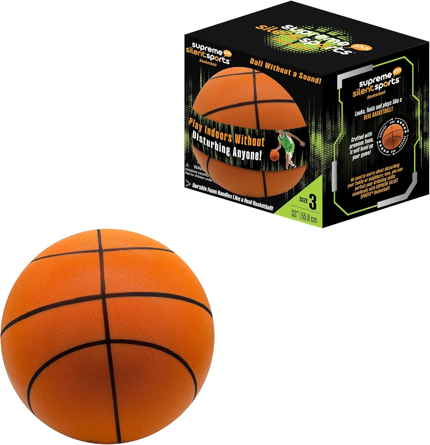 Upgrade your indoor training sessions and playtime with the Supreme Sports Silent Basketball, expertly designed for players who want to perfect their game, train and have fun without disturbing those around them. Whether you’re inside an apartment, at home, in a dorm, or shared space, this noise-free, quiet basketball lets you dribble, train, and play anytime—even at night.Crafted with high quality, soft, sound-absorbing premium foam, this ball completely dampens loud dribbles and noise. It’s perfect for indoor use on hardwood, tile, or carpeted floors while maintaining bounce! Train confidently indoors, anywhere—living rooms, bedrooms, hallways, kitchens and dining rooms. The gentle, non-marking foam is safe on walls, wood, tile, and carpets, and provides low-impact dribbling.Designed to help you develop faster reflexes, tighter handles, and better ball control, this ball is great for anyone—from kids just starting out to adults working on their dribble. It's the ultimate indoor solution for improving coordination and technique while having fun, without needing access to an outdoor court.There’s no inflating or maintenance required. Each ball arrives fully shaped—never shrunken—and keeps its round profile over time. No pump, no needles, no setup; just dribble and go whenever inspiration strikes. Sized for every learner. Pick your size: Size 7 (29.5"), Size 6 (28.5") and Size 3 (22").This product reduces sound compared to standard balls but is not guaranteed to be silent. Some noise may occur during use and will vary by surface and style of play.