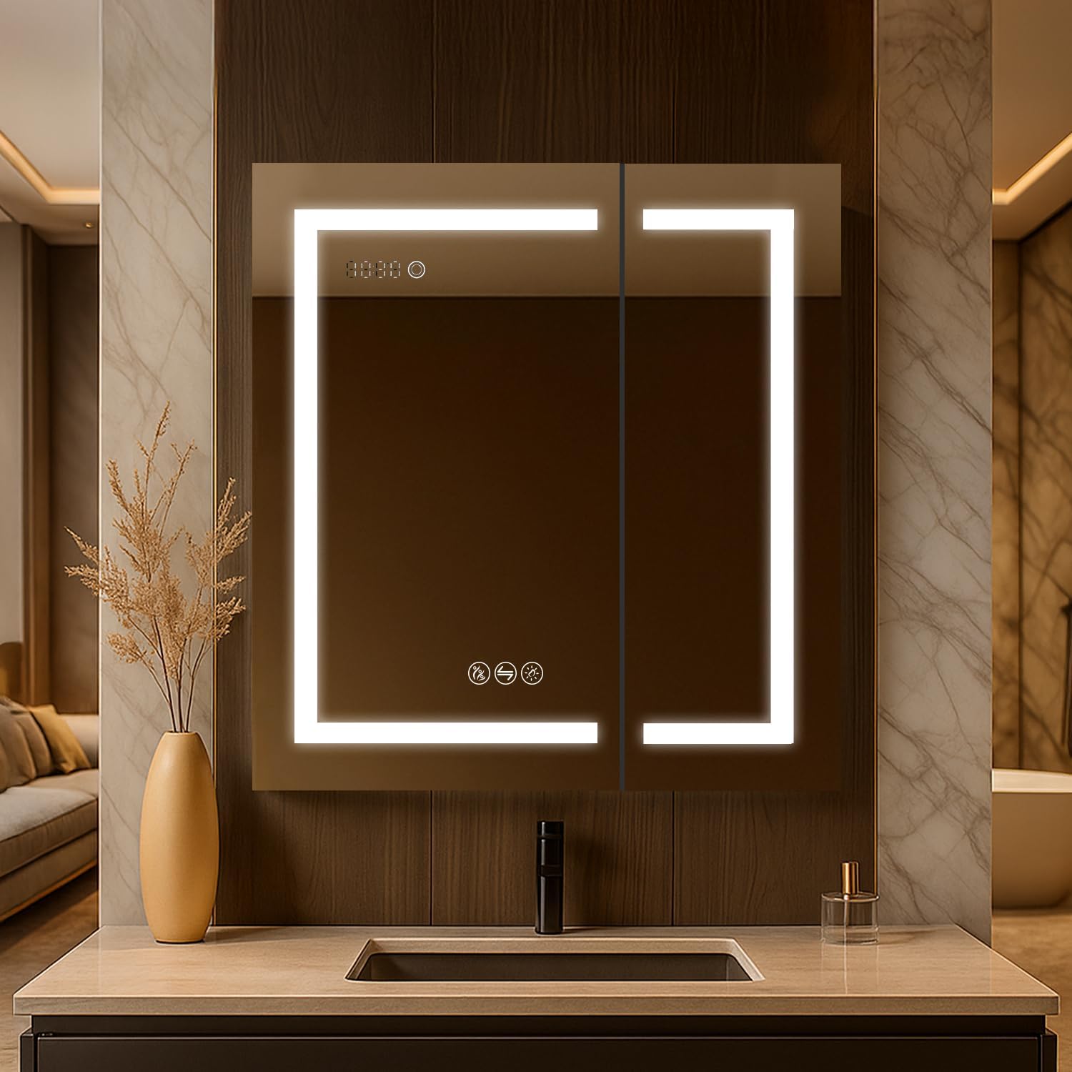 • Premium Mirror & Frame Construction: This LED lighted bathroom medicine cabinet is designed with a full mirrored interior and exterior, and a copper-free silver mirror front that resists black spots and oxidation. The tempered glass is treated with an anti-black coating for enhanced clarity, while the anodized aluminum frame provides a sleek, scratch-resistant, and corrosion-resistant finish that's built to last