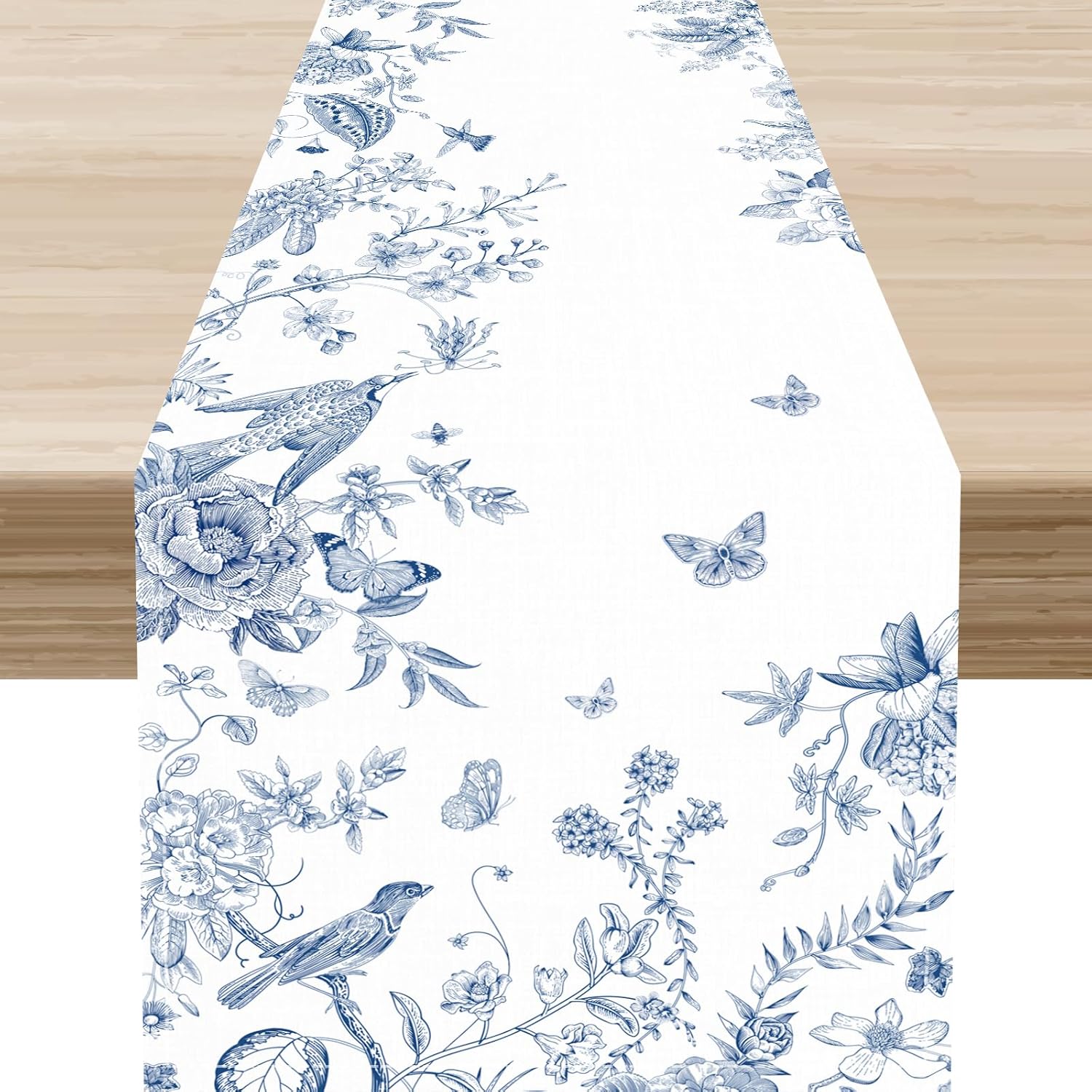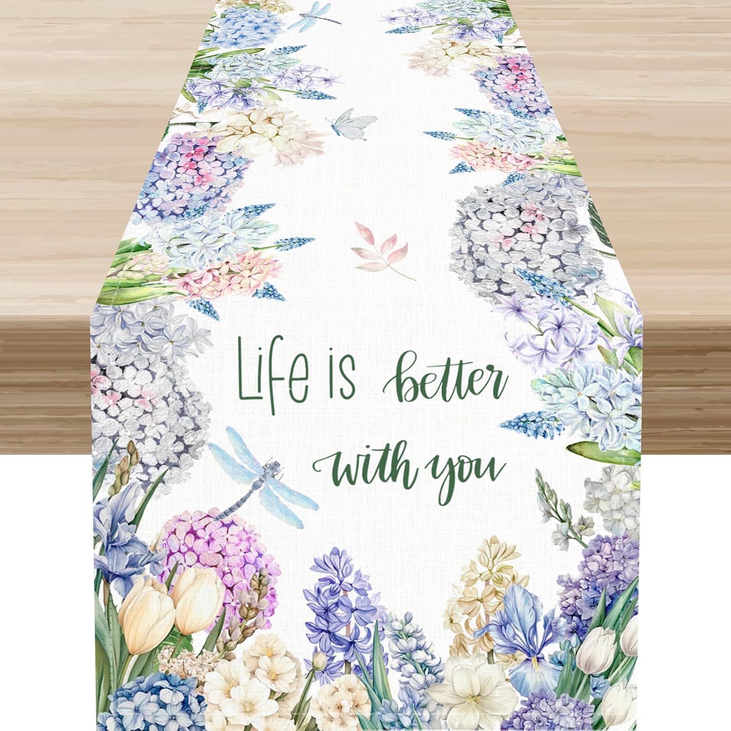 Blue Hydrangea Table Runner, Rustic Boho Watercolor Floral Spring Summer Seasonal Flower Butterfly Farmhouse Coffee Table Center Decor for Family Kitchen and Dining Party Table Decorations, 13"x108"