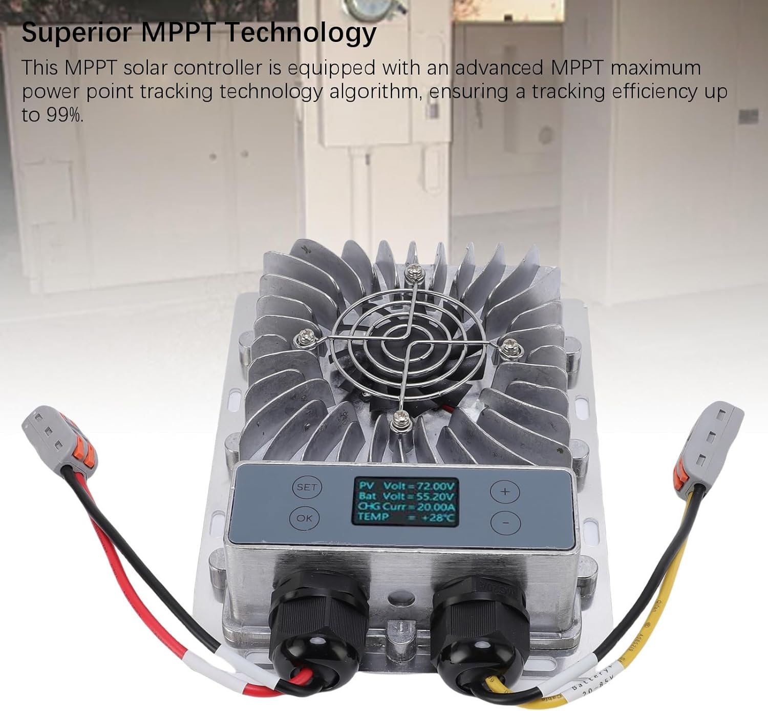 Item Type: MPPT solar charge controller Material: AluminumMaximum Output Power: 1200WInput Voltage: 25V-85VOutput Voltage: 20V-85VInput Current: 20AOutput Current: 20ANight Self-Consumption: Power Conversion Efficiency: 97%MPPT Efficiency: 99.50%Voltage Regulation Rate: 1%Charging Method: Constant voltage and constant currentCooling Method: Intelligent fan coolingOperating Temperature: -30°C to 65°CNoise: Rating: IP65Product Size: Approx. 172x138x47mm / 6.8x5.4x1.9inApplication Fields: Solar power generation, outdoor energy storage power supplies, rv backup power supplies, household appliances, lighting, digital products, solar toy carsCompatibility: Compatible with 24V 36V 48V 60V 72V batteries, compatible with 24V 36V 48V 60V 72V lithium ion systemsFeatures:LCD display for input output voltage and current Efficient MPPT real time tracking functionAdjustable output voltage Rainproof, dust proof, and shockproofSupports various batteries including lithium ionIntelligent temperature control with fan coolingHigh efficiency synchronous rectification scheme Supports activation of lithium ion batteriesHigh definition LCD displayPackage List:1 x MPPT Solar Charge Controller1 x User ManualNote:1. Installation should be carried out by professional personnel or assisted by local dealers.2. Input and output lines should be clearly distinguished to prevent incorrect connections.3. Battery positive and negative poles should be correctly aligned, and battery voltage should match the machine model.4. Do not expose the equipment to harsh environments like humidity, flammable conditions, or heavy dust accumulation; Do not cover or block ventilation slots.5. Leave over 10 cm of air circulation space around the device for good heat dissipation.