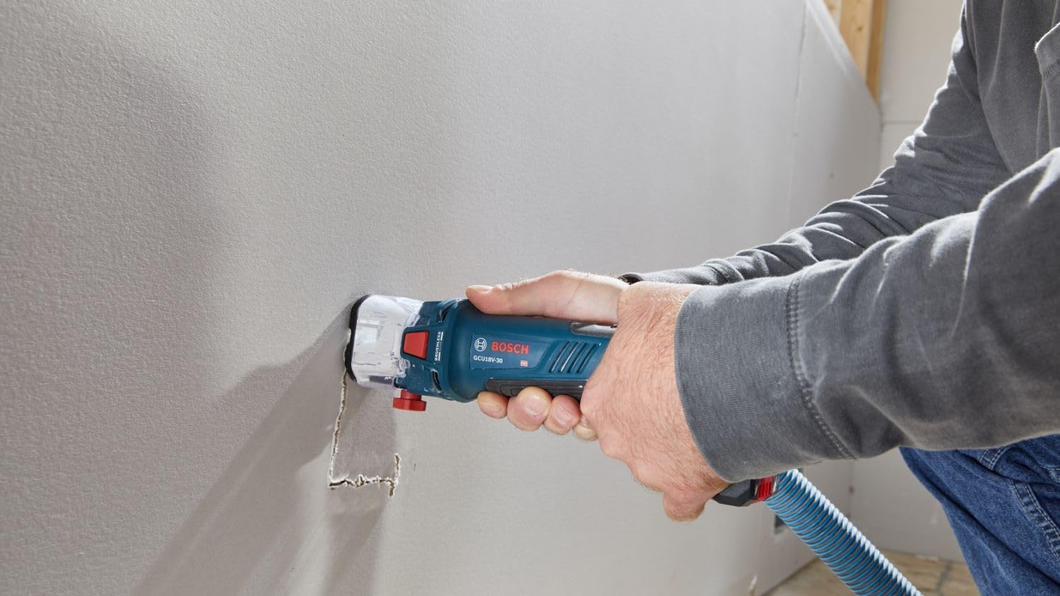 The Bosch GCU18V-30N 18V Brushless Cut-Out Tool provides fast professional cutting, for better productivity. The compact tool is ergonomic and provides straightforward handling. It has a slim-grip design. The brushless motor provides corded-equivalent performance. When paired with the Bosch GBA18V40 CORE18V 4.0 Ah Compact Battery (sold separately), this cut-out tool can cut up to 300 linear Ft. on a single charge. The convenience brake quickly stops the tool. The adjustable foot plate provides depth adjustment, to easily control the depth of cut. The cut-out tool features soft-start technology, which reduces startup torque, and an LED light on the cut-line that illuminates the dark work areas that are often common on interior finishing applications. It also features an IP 5X-rated dust-resistant switch to help prevent dust from getting into the switch. It withstands dusty jobsite conditions, and is IP 5X rated. This tool is ideal for drywall and plasterer pros, with cutting in acoustical tile, plywood and more. This is a bare-tool kit; the battery and charger are sold separately.