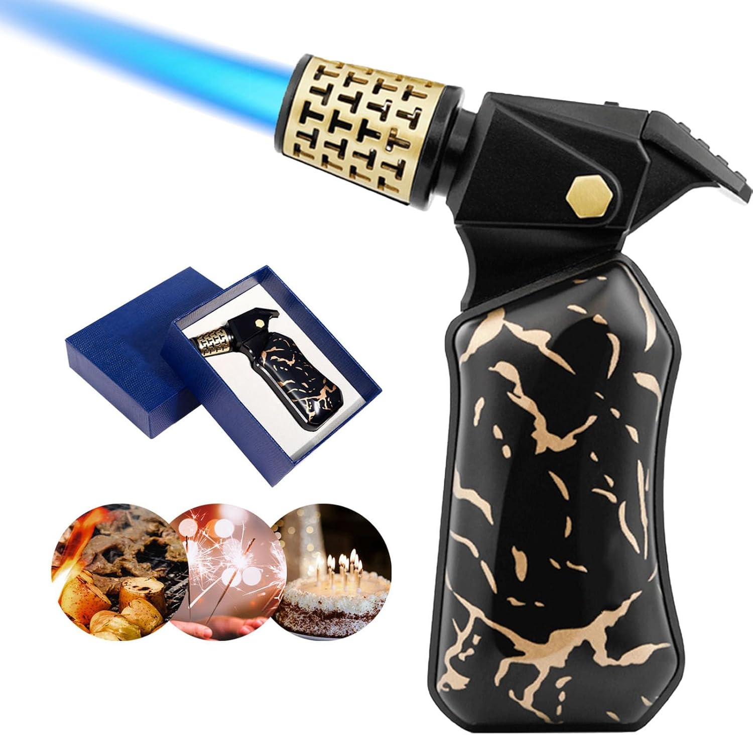 Why Choose Us?This torch lighter merges professional-grade performance with everyday practicality. Its sleek design and intuitive features make it a must-have for cooks, adventurers, and anyone who values reliability.- Flame Type: Pure blue jet flame (high-pressure injection technology)- Safety Features: Dual locking system (flame lock & childproof switch)- Adjustability: Foldable flame regulator for precise control- Refill System: Vertical butane refill design with leak-proof valve- Butane Torch Lighter Pure Blue Precision Flame, Experience instant, odorless ignition with concentrated blue jets. Perfect for tasks requiring focused heat—from caramelizing desserts to lighting outdoor torches.- Flame Lock: Engage the slide-right lock to maintain continuous flames without holding the trigger.- Adjustable Flame: Refillable Kitchen Cooking Torch Rotate the base dial to switch between gentle simmering flames and powerful jets.Package Include:Lighter x 1Elegant Gift Box x1In order to comply with safety regulations, lighter is WITHOUT gas.Refill with butane gas before using.If you have any questions about this product, please contact us in time, we will reply you within 24 hours and give you a satisfactory solution