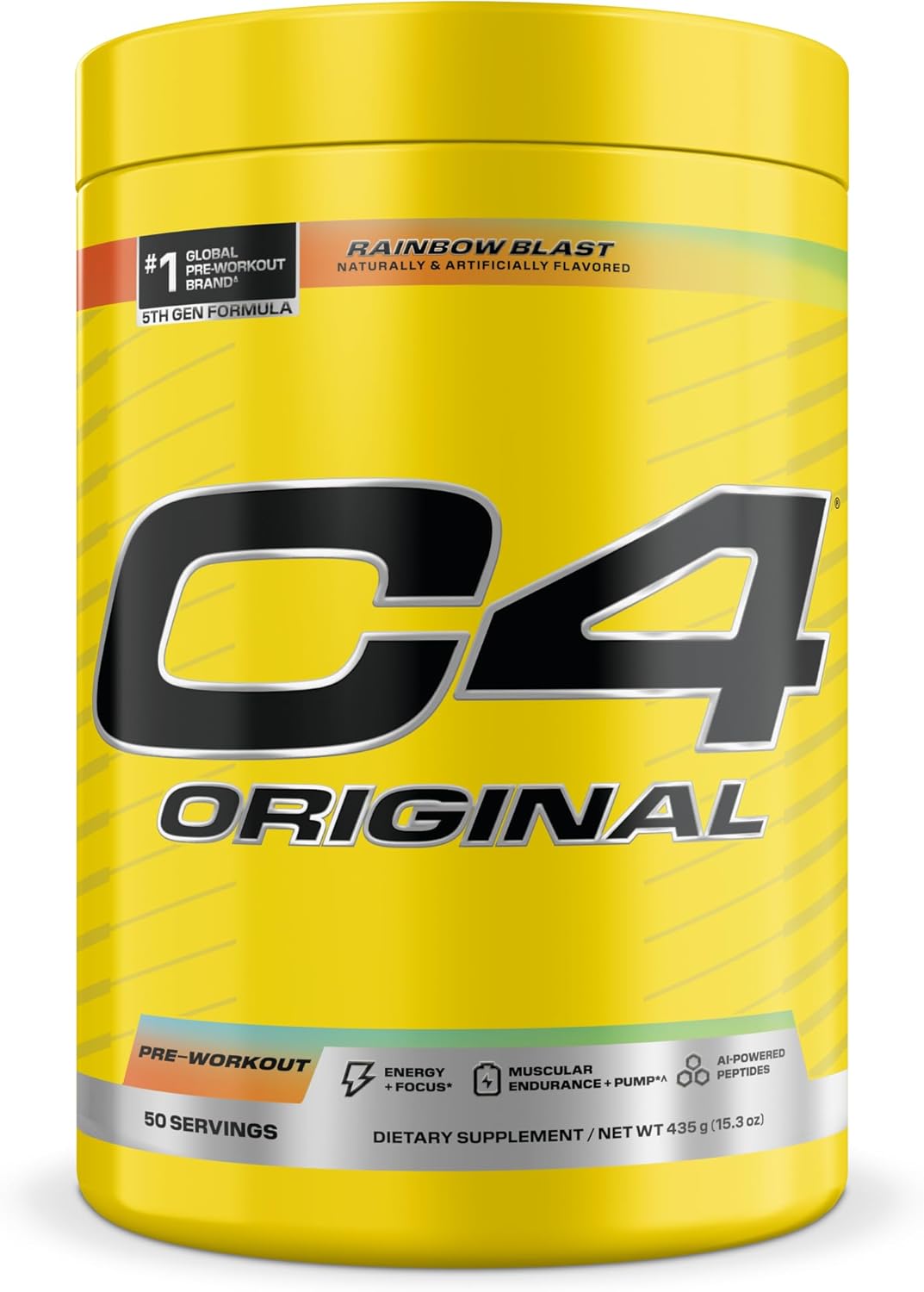 Time to smash workouts and redefine gym excellence The new, enhanced C4 Original formula is your key to next-level performance hitting the gym HARDER than ever before. This powerhouse pre-workout blend, packed with 200mg of caffeine and 2g of CarnoSyn® Beta-Alanine*, guarantees sustained energy and endurance to help you power through even the toughest sets. The dynamic duo L-Citrulline and L-Arginine keeps your training sessions going longer and harder, as Creatine Nitrate fuels your performance for maximum gains. Plus, with AI-powered PeptiPump®, exclusive to C4 maximizing your performance, and Tyrosine and Huperzine A for improved focus, whether you're hitting it hard with Megasets or taking it easy with low-intensity training, the revamped C4 Original formula will keep you powered up so you can unleash your best self. ^Studies have shown benefits of CarnoSyn® Beta-Alanine to be correlated with cumulative use.