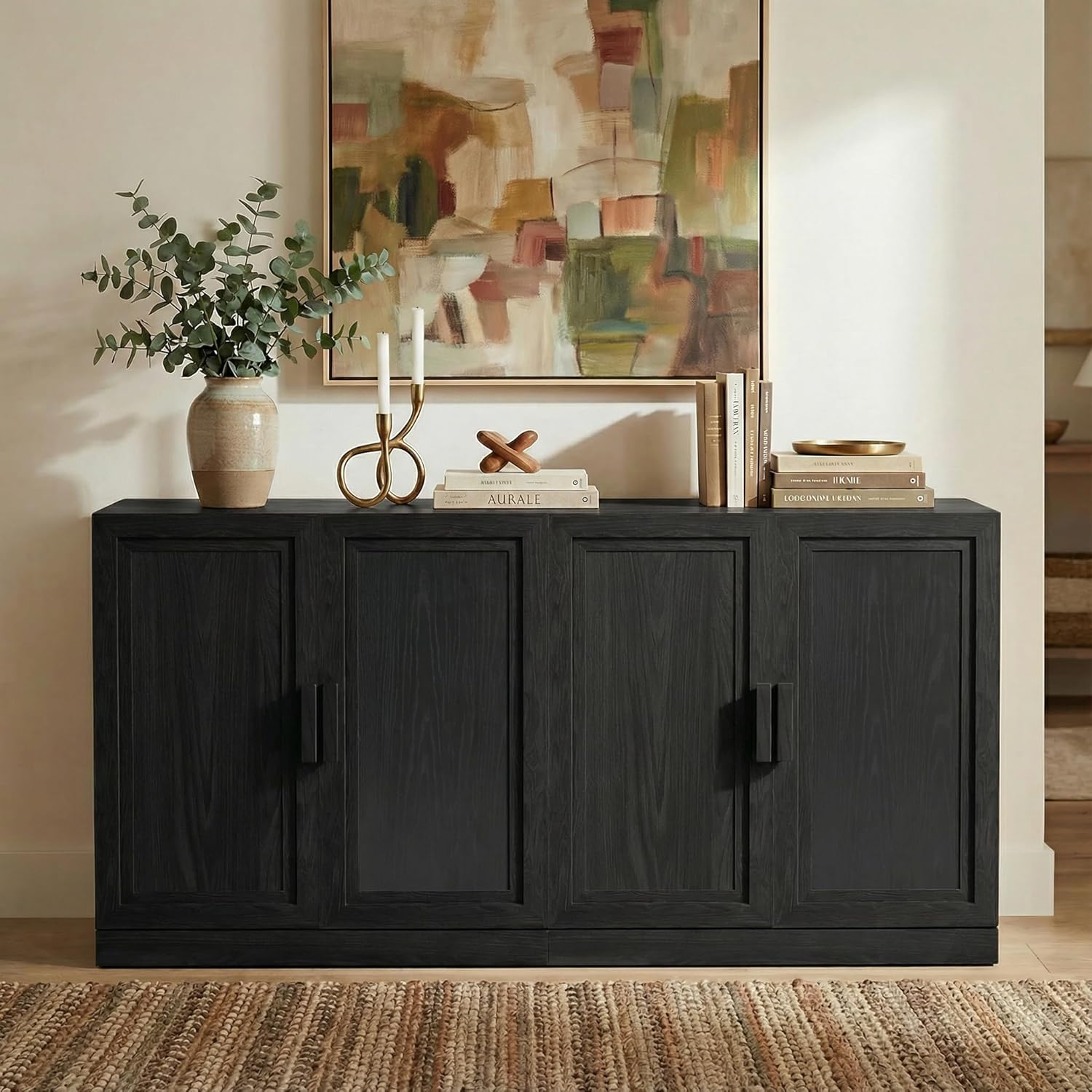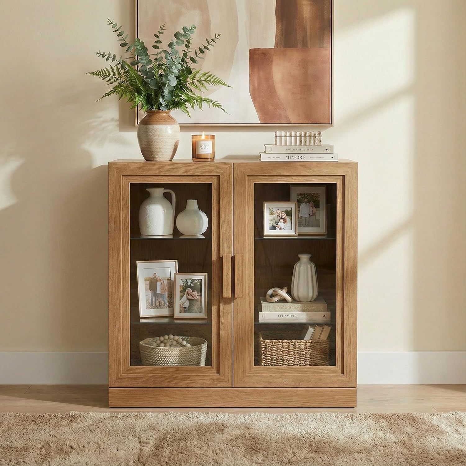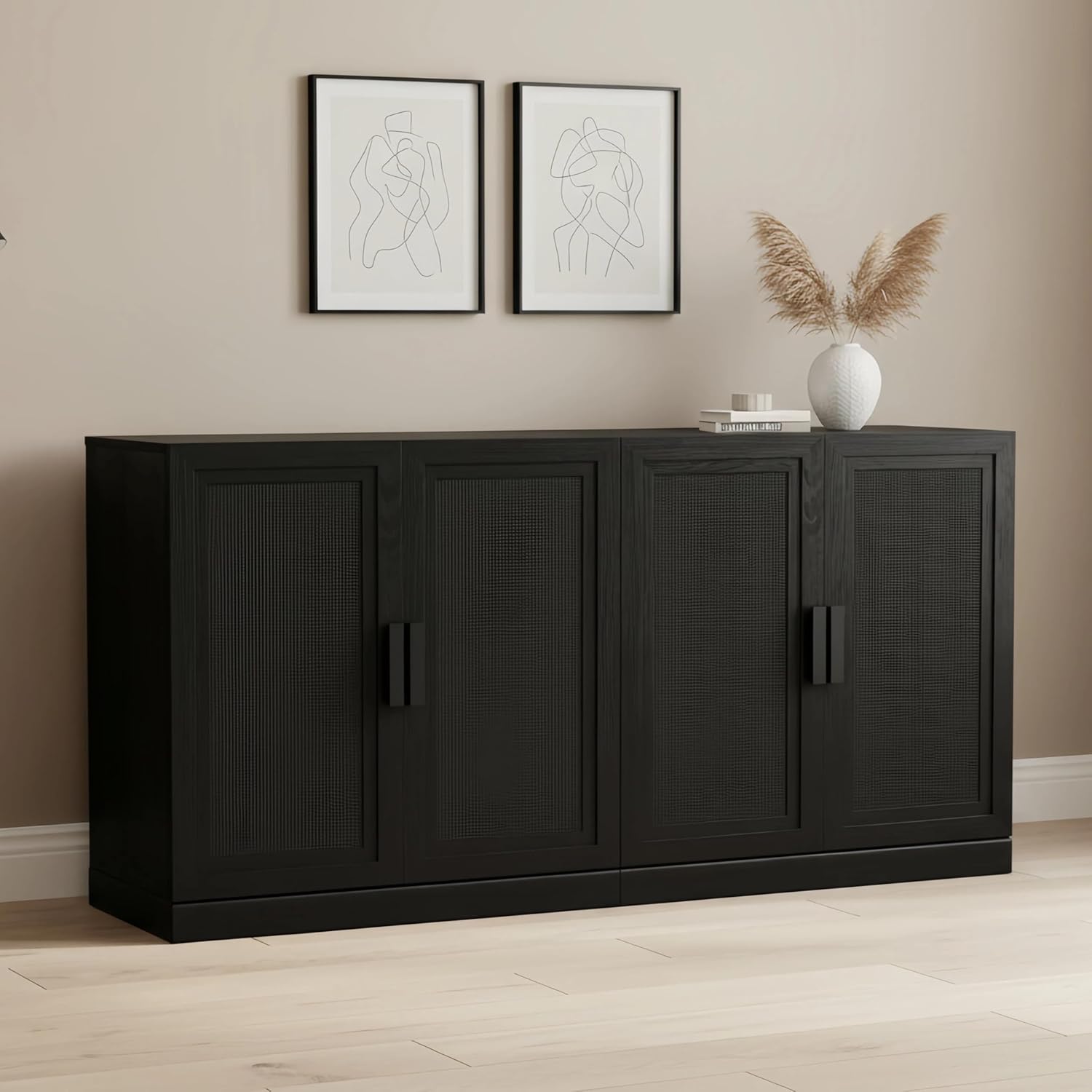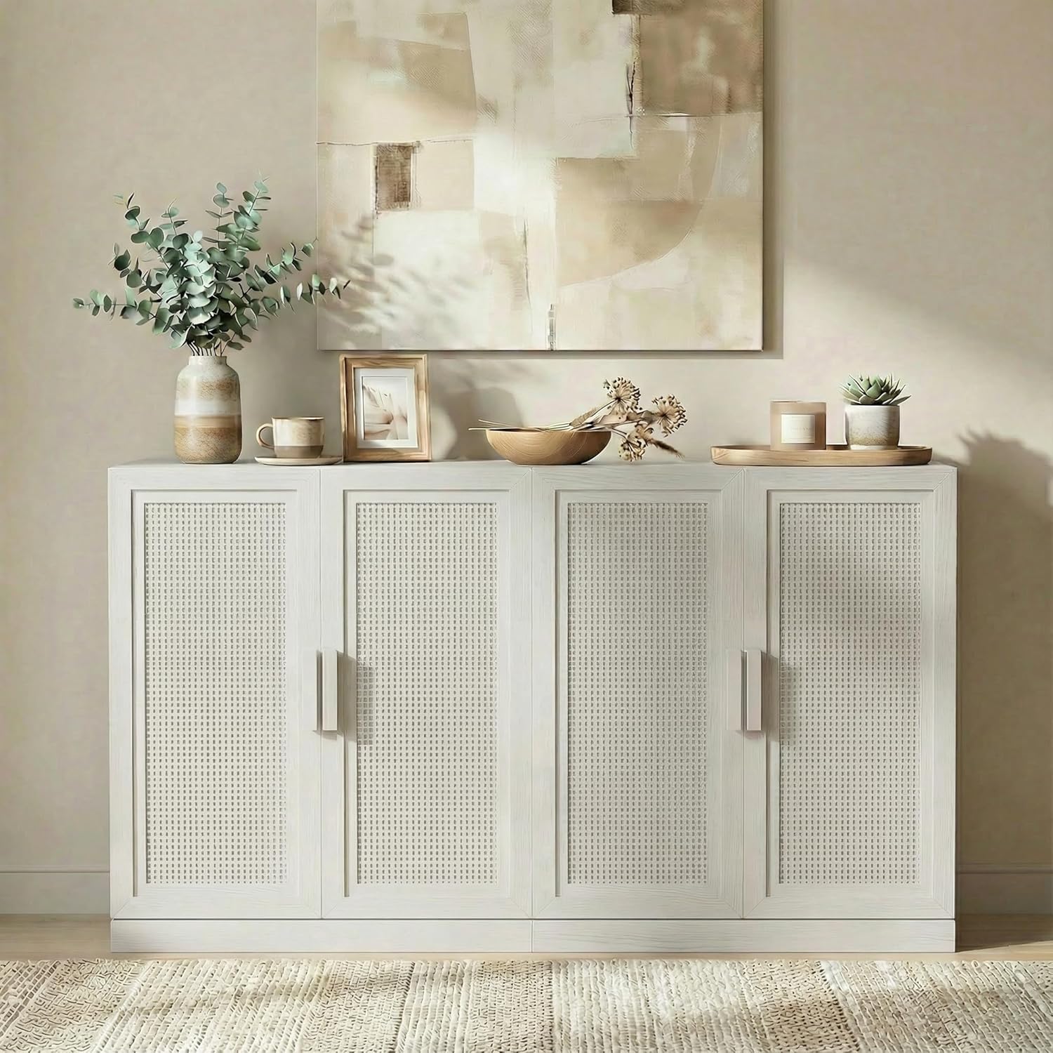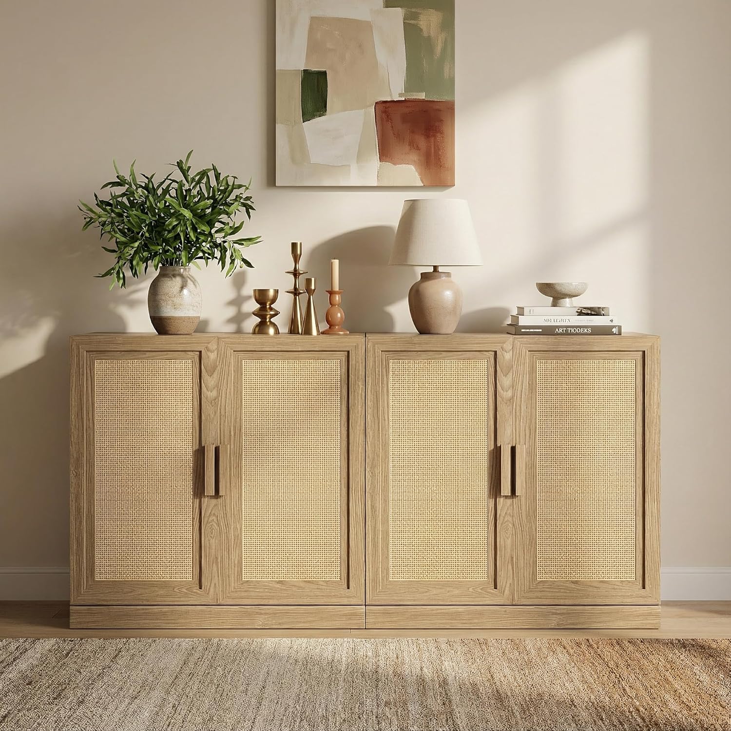 Timeless Design · Modern Minimalism: The Adam Series blends classic elegance with clean, contemporary lines, bringing balance and warmth to any space with its refined silhouette and natural charm.Refined Craftsmanship · Thoughtful Details: Natural wood veneer is treated with antifouling and scratch-resistant finishes, offering a smooth matte texture that’s easy to maintain. Doors combine handwoven cane panels with carved wood handles and smooth adjustable hinges.Functional Storage · Flexible Layout: Available in multiple sizes and configurations, each cabinet includes adjustable shelves and cord cutouts for easy wire organization—ideal for the living room, dining area, or entryway.Modular Design · Personalized Combinations: A fully modular system that adapts to your needs. Combine units to create a tall bookcase, a wide sideboard, or a console media cabinet. Expand effortlessly with other pieces from the Adam Collection.Safe Structure · Simple Assembly: Includes an anti-tip safety device for secure wall attachment. Recommended two-person assembly with an easy step-by-step guide—installation takes approximately 50 minutes.Dimensions: 62"(W) x 31"(H) x 16"(D)Weight: 122 lbsMaterials: P2-MDF with natural wood grain; solid wood door panels