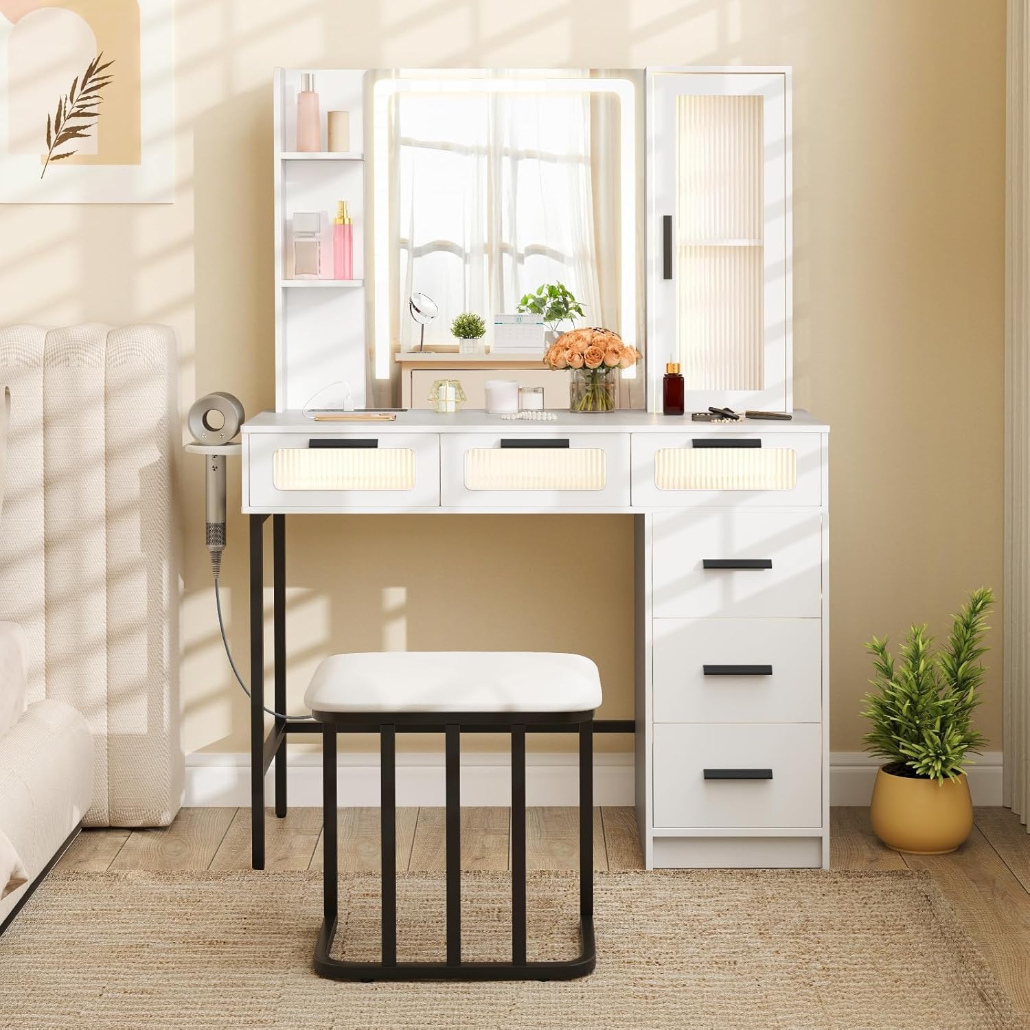 Description:Enhance your daily routine with our dressing table with stool! Featuring 2 AC outlets, 1 USB port and 1 Type-C port, you can conveniently power up your devices while getting ready. The HD lighted mirror offers adjustable brightness and 3-color lighting options. With sensing function, the lights will auto turn on as you approach (sensing distance within 3.3 ft) and auto turn off after you leaving 30s or outside the sensing distance. Moreover, you stay organized with ample storage including drawers and a cabinet. With its modern design and thoughtful features, this vanity desk with chair makes a stylish and practical gift for loved ones. Features:Equipped with a 3-color LED lighted mirrorEasy to control the lights with touch switchInduction lights auto on as you approachBuilt in charging station with 2 AC outlets, an USB port and a Type-C portAmple storage space with 6 drawers, a cabinet and a hair dryer rackIncludes a matching stool with padded seat cushionCan be fixed to the wall with the included anti-toppling deviceAdds more charm and elegance with translucent acrylic drawer frontsReliable stability with adjustable foot padsSmooth opening and closing with metal drawer slidesIdeal gift for yourself and your loved onesAssembly needed Specifications:Color: WhiteMaterial: MDF, Metal, Silver Mirror, Velvet Fabric, SpongeTable Dimension: 39.5" x 15.5" x 54.5" (L x W x H)Stool Dimension: 15.5" x 12" x 17.5" (L x W x H)Mirror Dimension: 20.5" x 24.5"Weight Capacity of Tabletop: 110 lbsWeight Capacity of Stool: 330 lbsAC Outlets: 100-240V/10AUSB Port: 5V/2AType-C Port: 5V/2APower Cord Length: 4.2 ftNet Weight: 78.5 lbsPackage includes:1 x Vanity Table1 x Vanity Stool1 x User Guide