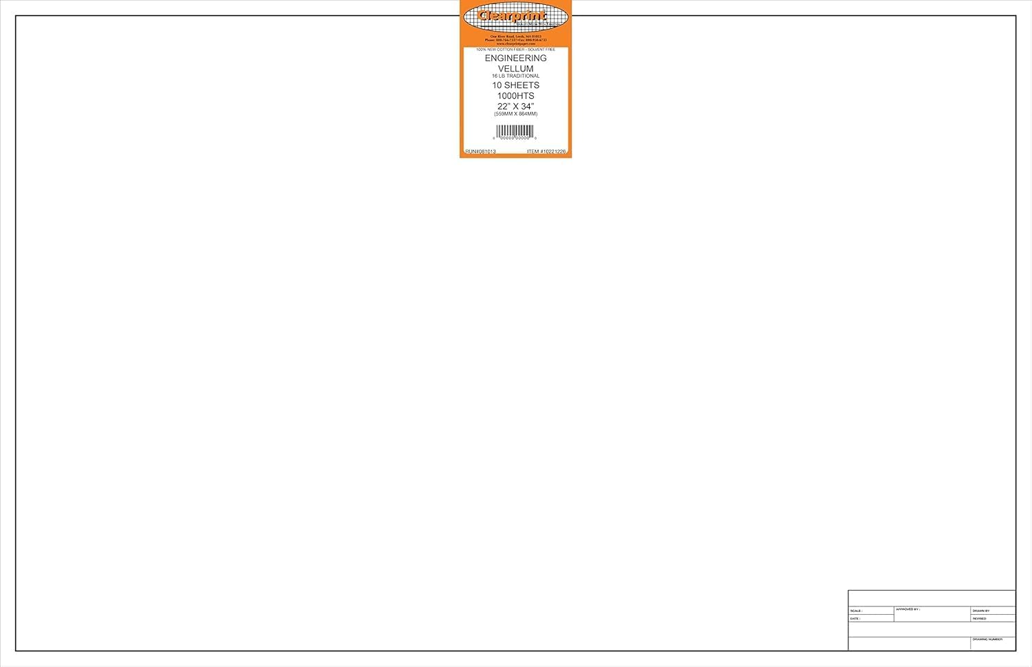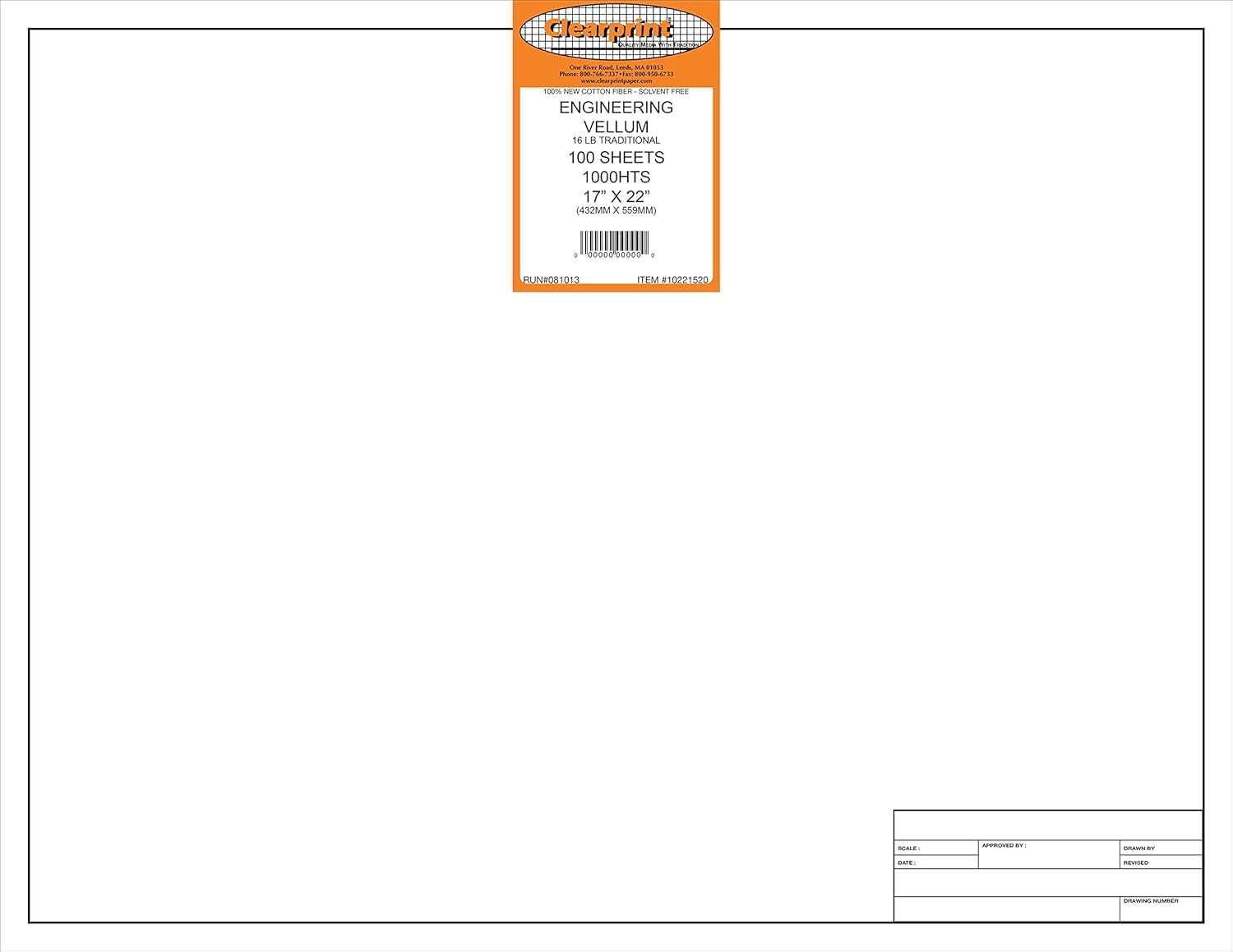 Use Clearprint 1000H Design Vellum Sheets with Engineer Title Block, 16 lb., 100% Cotton, 18" x 24", 10 Sheets Per Pack to produce professional drawings with translucent paper made of 100% new cotton fiber. This paper boasts acid-free archival quality, strength, erasability without ghosting and redraw characteristics. Pre-printed title block clearly identifies and organizes multiple versions of plans. Use with pencil, ink and traditional drafting products. Paper is transparentized without solvents to produce a permanent transparent drawing surface, which is also printable in laser and inkjet printers. Made in USA.