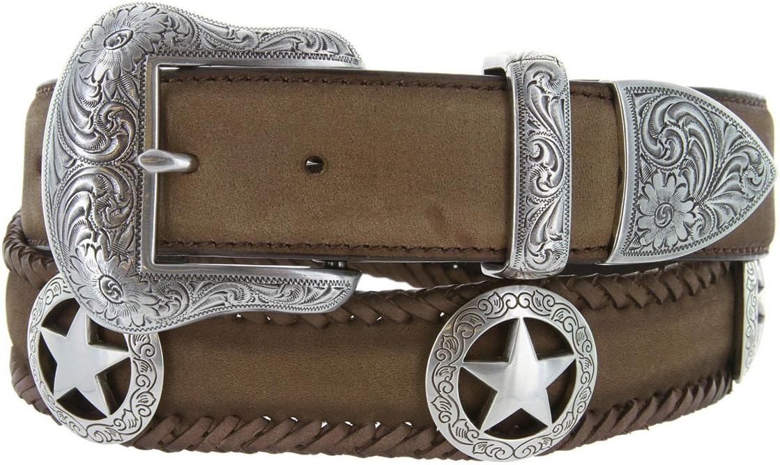 Made from high-quality genuine cowhide leather, 1-1/2"(38mm) wide western crazy horse scalloped hand laced braided edge oil tanned harness leather Belt.Belt buckle set: material zinc with hand-polished antique floral engraved brass patina color finish three piece buckle set.Ornament: material zinc with hand-polished antique engraved brass color finish berry conchos.Designed and assembled in the U.S Western cowboy cowgirl style crazy horse leather hand laced belt great for casual jeans or rodeo wears.The belt is measured from the fold where the buckle is to the center hole. In order for you to get the best size, measure a belt that works for you from the fold to the hole where you wear the belt.