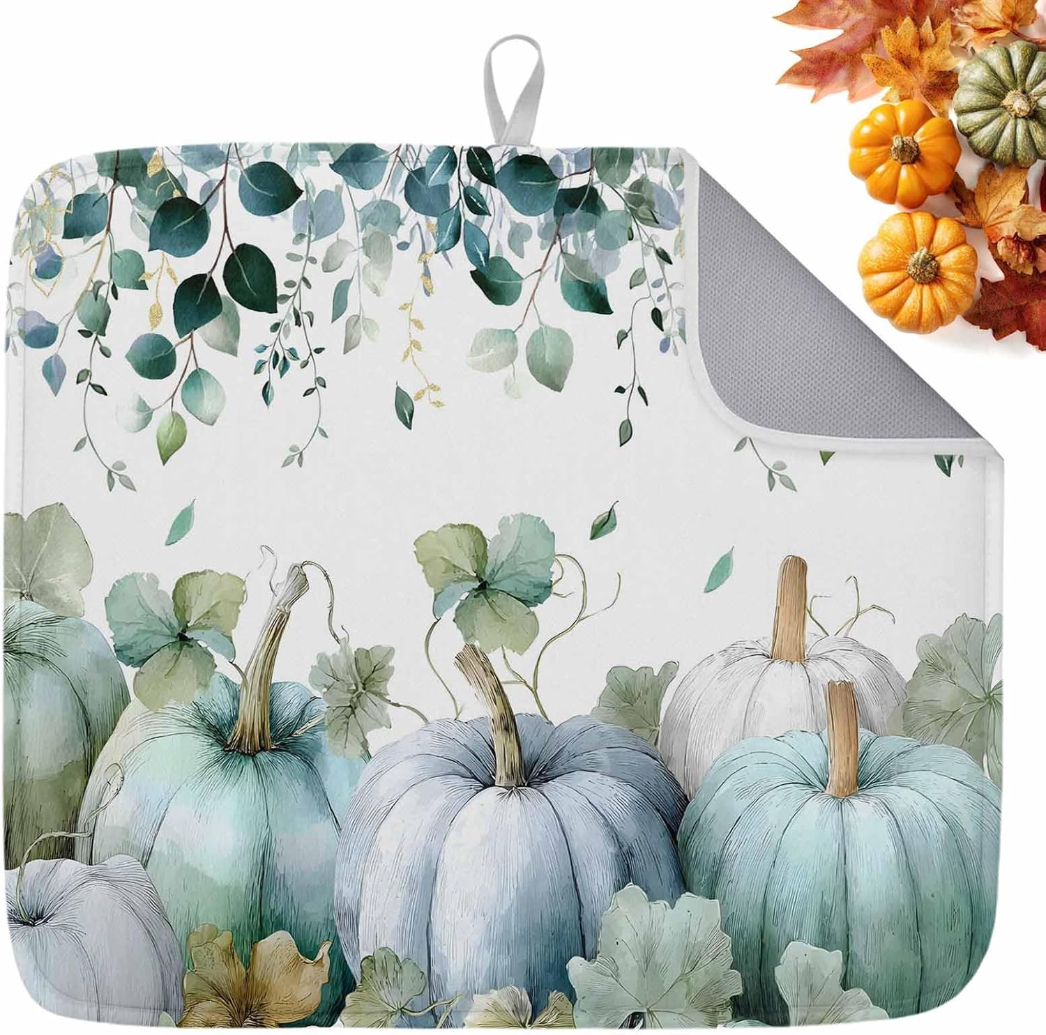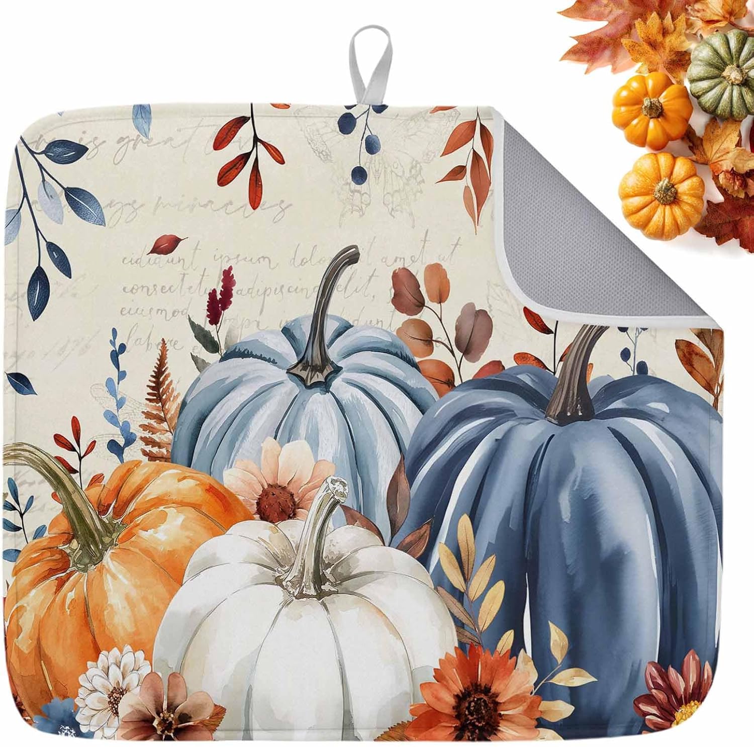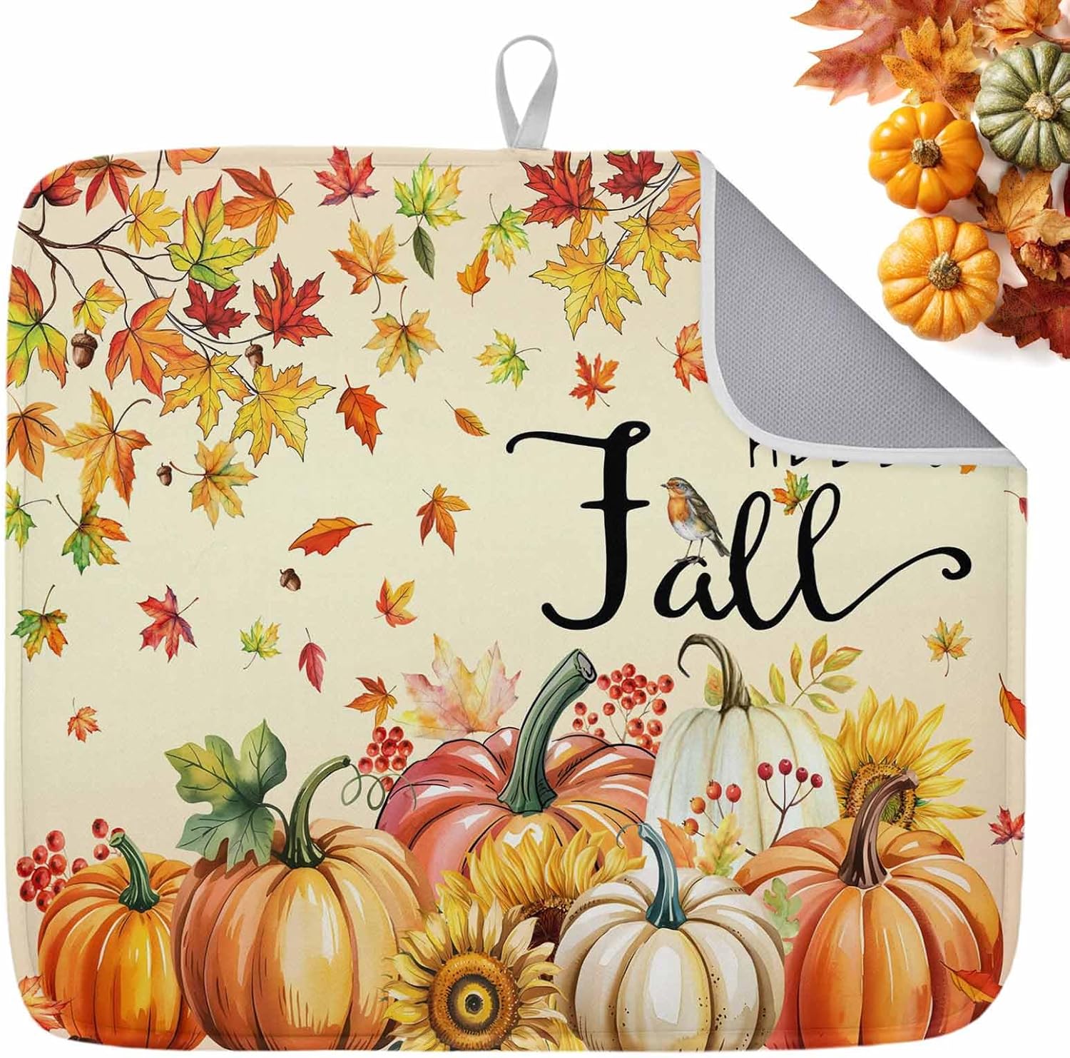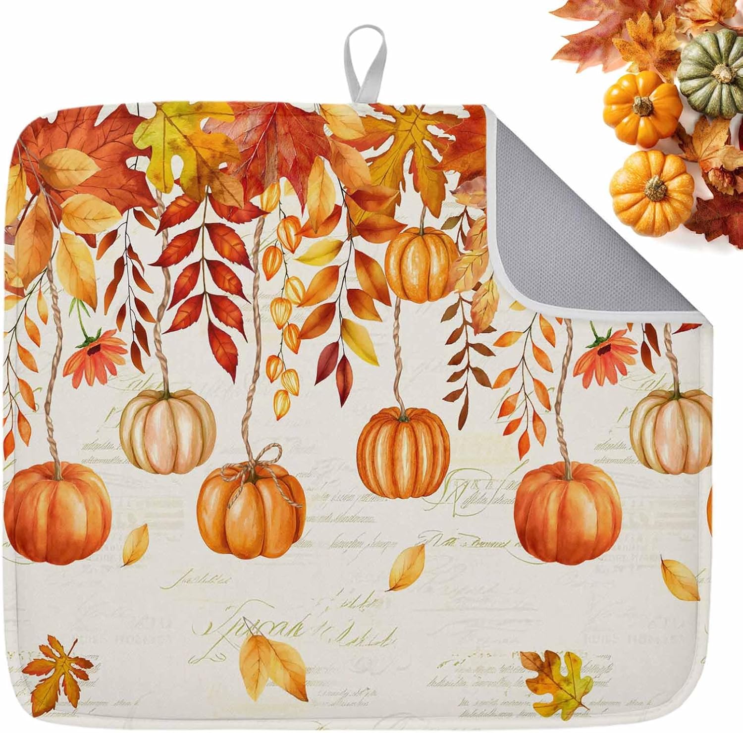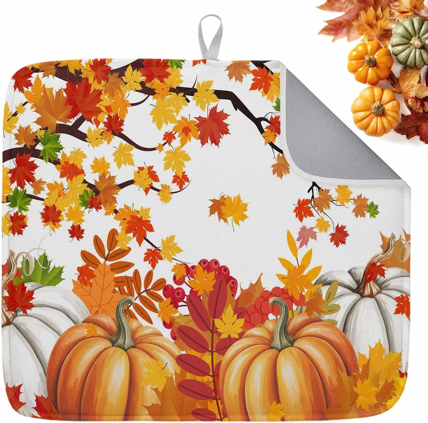 Maybe you wash most of your items in the dishwasher, but some crystal vases, glasses, and delicate items, as well as pots and pans and other items that don't fit in the dishwasher, need to be hand washed.A soft dish Fall Drying Mat is a good option for handwashing.High Quality Fall Drying Mat- The surface of the Fall Drying Mat for kitchen counter is composed of soft microfiber material.- Dish mat with elastic sponge interlayer, high water absorption.- The bottom of the dish mats for counter is made of natural rubber, which is non-slip.Fall Drying Mat For Kitchen CounterDish mat drying kitchen mat placed on the countertop quickly absorbs water splashes while washing dishes at the sink, avoid water spots from running into the cabinets.Fall Drying Mat For TableDry mat for dishes can be used as placemats to isolate high-temperature food and avoid tableware from scratching the tabletop to protect the integrity of the tabletop.Dog Dish MatRustic dish drying pad can also be used as pet utensils pads to avoid stains from seeping into the ground after pets overturn the food while eating, reducing the time for housework.Mouse PadPortable dish Fall Drying Mat works great with the mouse, absorbs drips from a frosty drink, cushions your arm against the hard table top, and has plenty of space left over for a notepad and pencil jar.Coffee Maker MatDish mat drying quickly capture coffee splatter and protect expensive kitchen countertops and other interior surfaces from coffee splatter or coffee bean stains.Great Gift IdeaFarmhouse dish Fall Drying Mat is the best gift for family and friends because of its stylish design and strong water absorption, suitable for housewarming, birthday parties, weddings, Thanksgiving, etc.
