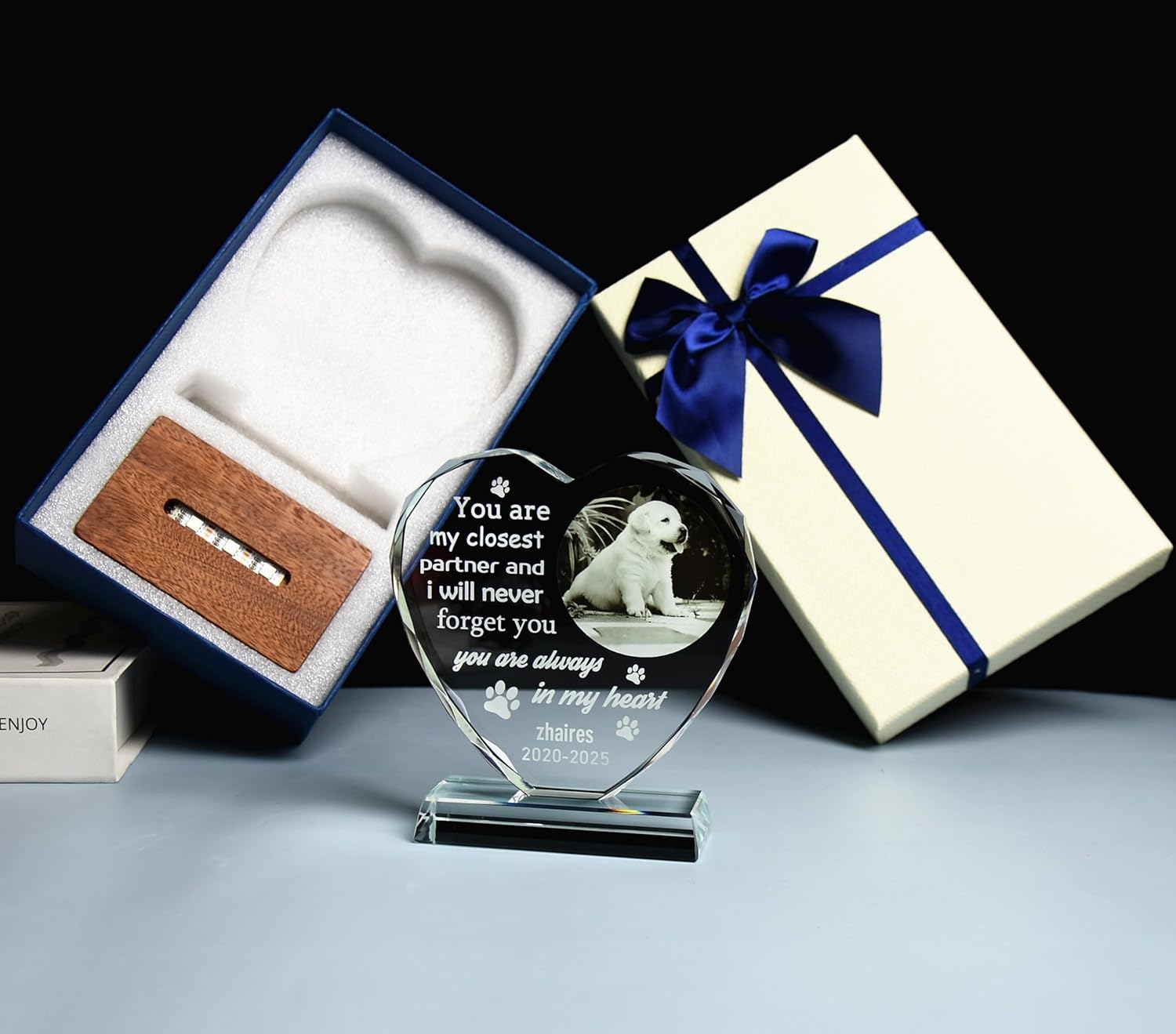 Our pet memorial gift is made of high-quality crystal, which is transparent, shiny, and durable. All patterns and text are laser-engraved into the crystal, making it resistant to wear and fading. We also use a colorful LED base made of high-quality beech wood. The personalized crystal photo frame is paired with an exquisite solid wood lamp base, making the product more suitable as a sympathy gift and collection.