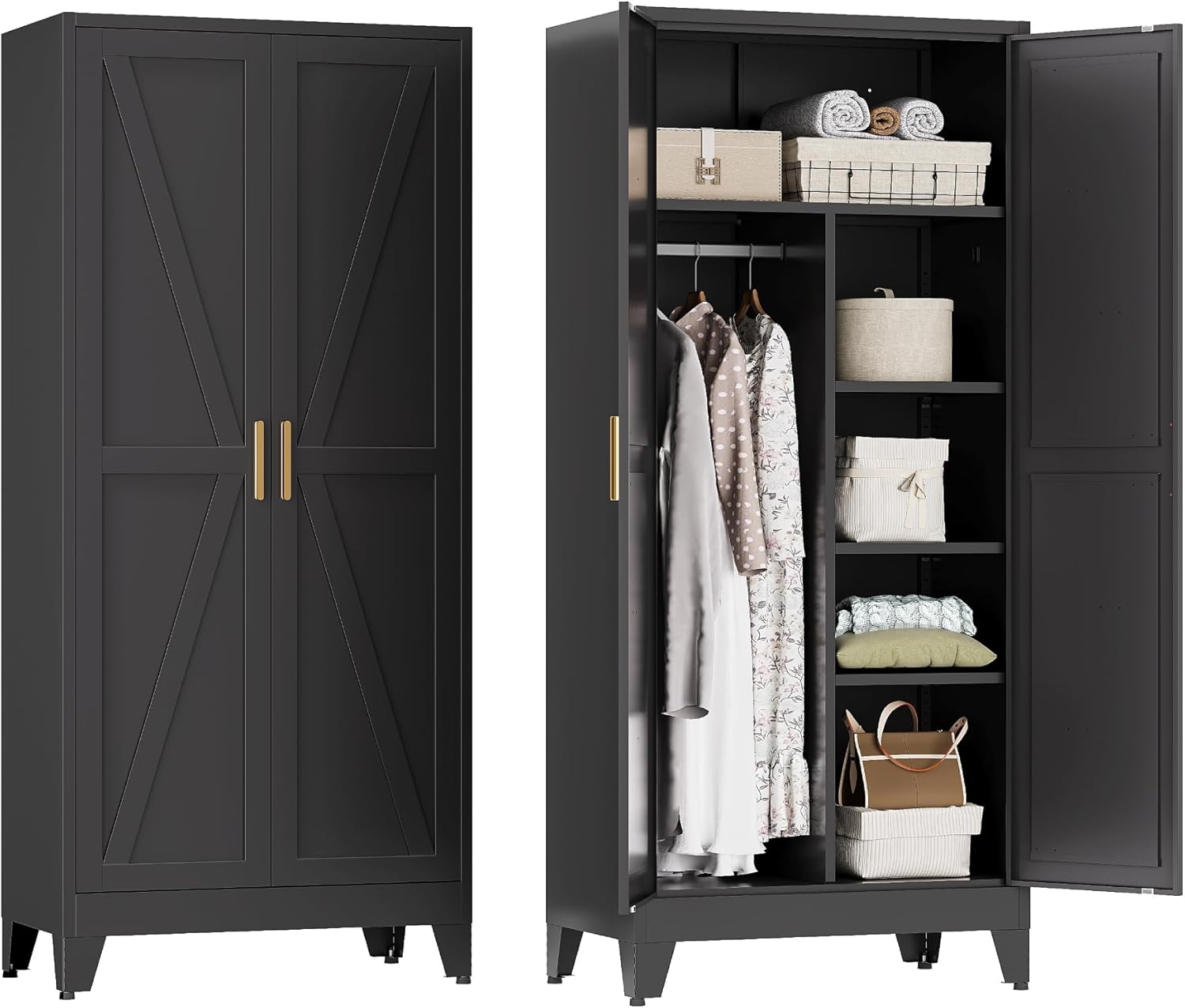 Farmhouse Wardrobe Cabinet ,Metal Wardrobe Closet with Hanging Rod,Metal Armoire with Adjustable Shelves for Bedroom,Living Room, Cloak Room,Office (Black)