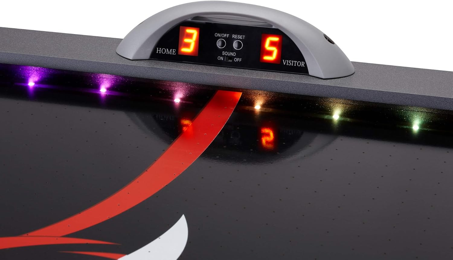 Who This Is For The Fat Cat Volt is designed for air hockey enthusiasts who want the ultimate gaming experience with cutting-edge LED technology. This 7-foot air hockey table delivers professional-level gameplay with dual motor power, automatic scoring, and an exclusive light-up playfield that transforms any game room into an arcade. Perfect for families, man caves, basements, and recreational spaces. Exclusive LED Illuminated Playfield What makes the Volt truly unique is the innovative LED lighting system built directly into the playing surface. The super bright LEDs create an immersive gaming atmosphere unlike any other table. The LED display syncs with the Volt's integrated music system, telling the story of each game and flashing bright when players score. Your game room will never be the same. Dual Motor Power The Volt features dual motor action for faster play than traditional single-motor tables. Two powerful motors work together to supply a generous cushion of air across the entire playing surface, ensuring smooth puck flight from corner to corner. The ultra-fast gliding surface combined with dual motor airflow delivers arcade-quality gameplay. Automatic Scoring with Music System Keep track of every goal with the automated LED electronic scorer. The integrated music system provides entertaining sounds throughout the game, announcing scores and building excitement during competitive matches. Exciting Playfield Graphics The exclusive playfield design brings new excitement to every game night. Bold graphics invoke the feeling of fierce competition while the extra-glossy surface ensures consistent puck movement. Easy Assembly with All Tools Included Unlike other air hockey tables that require you to supply your own tools, the Volt comes with all tools included for easy assembly. Setup takes approximately 60 minutes with 2 people. What's Included The Volt comes ready to play with pucks and pushers included. Product Dimensions 83 in L x 42 in W x 31 in H | Weight: 120 lbs | Players: 2 | Warranty: Limited 90 Day