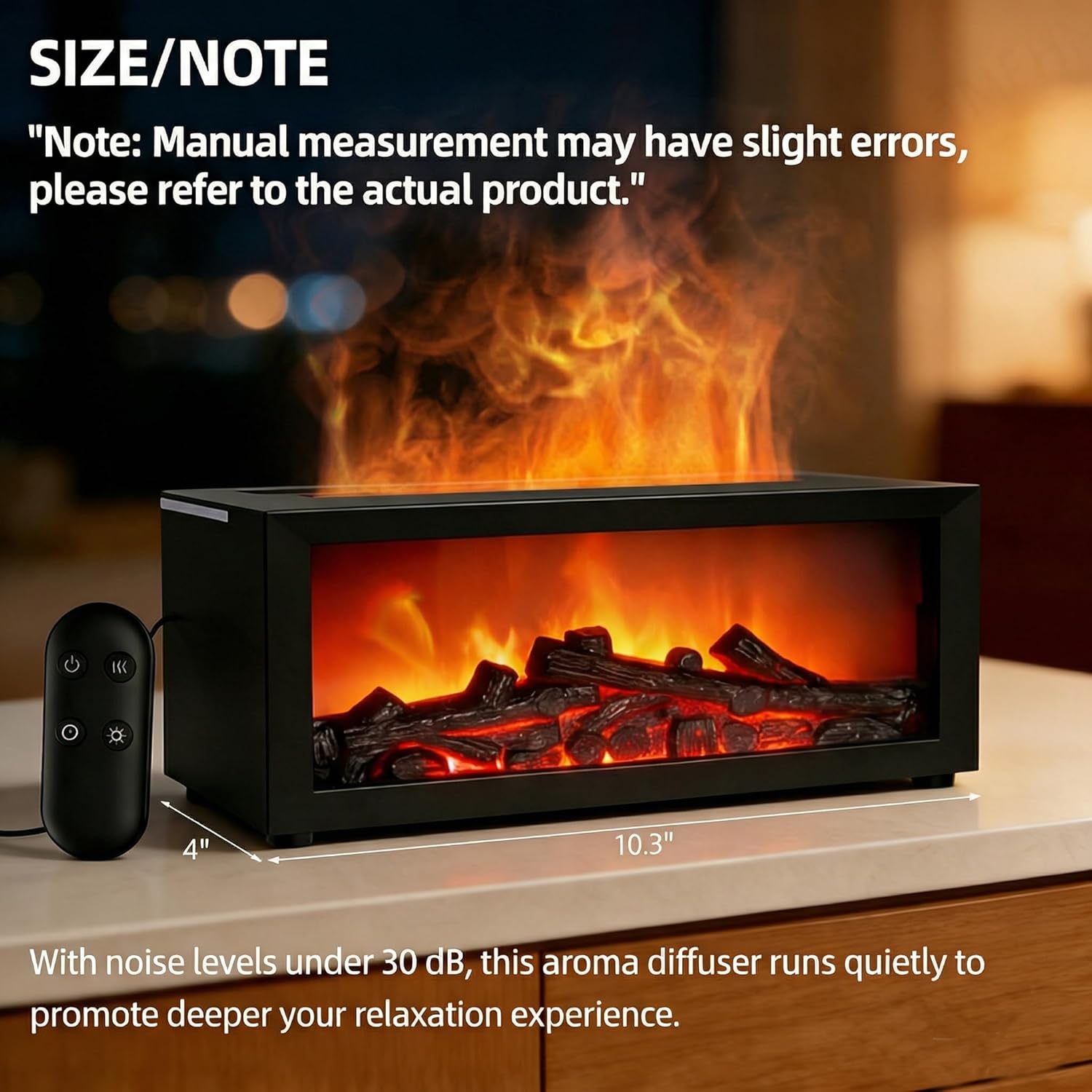 | Additional Features | Color Changing, Cool Mist Aromatherapy, Imitation Fireplace Light Display, Remote Control |