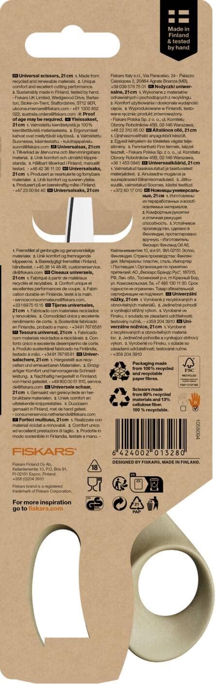 Product Description Recycled universal scissors (blade length: 10 cm) for cutting thick and thin materials, Optimally suitable for right-handers as well as for hands of different sizes - Comfortable grip and firm hold thanks to ergonomic handles made from 62 Percent recycled plastic and 38 Percent cellulose fibre, Made from 100 Percent recyclable materials - Fast and clean work thanks to long blades made of stainless and recycled steel, effortless cutting thanks to adjustable blade tension - Hand-tested, FSC-certified packaging made from recycled materials, High durability, Dishwasher safe, Made in Finland - Contents: 1x Fiskars Functional Form Recycled Universal Scissors, Dimensions: Cutting blade length 10 cm, Total length: 21 cm, Weight: 84 g, Material: Recycled stainless steel/plastic, Colour: Grey, 1058094 Set Contains: 1x Fiskars Functional Form Recycled Universal Scissors, Dimensions: Cutting blade length 10 cm, Total length: 21 cm, Weight: 84 g, Material: Recycled stainless steel/plastic, Colour: Beige, 1058094