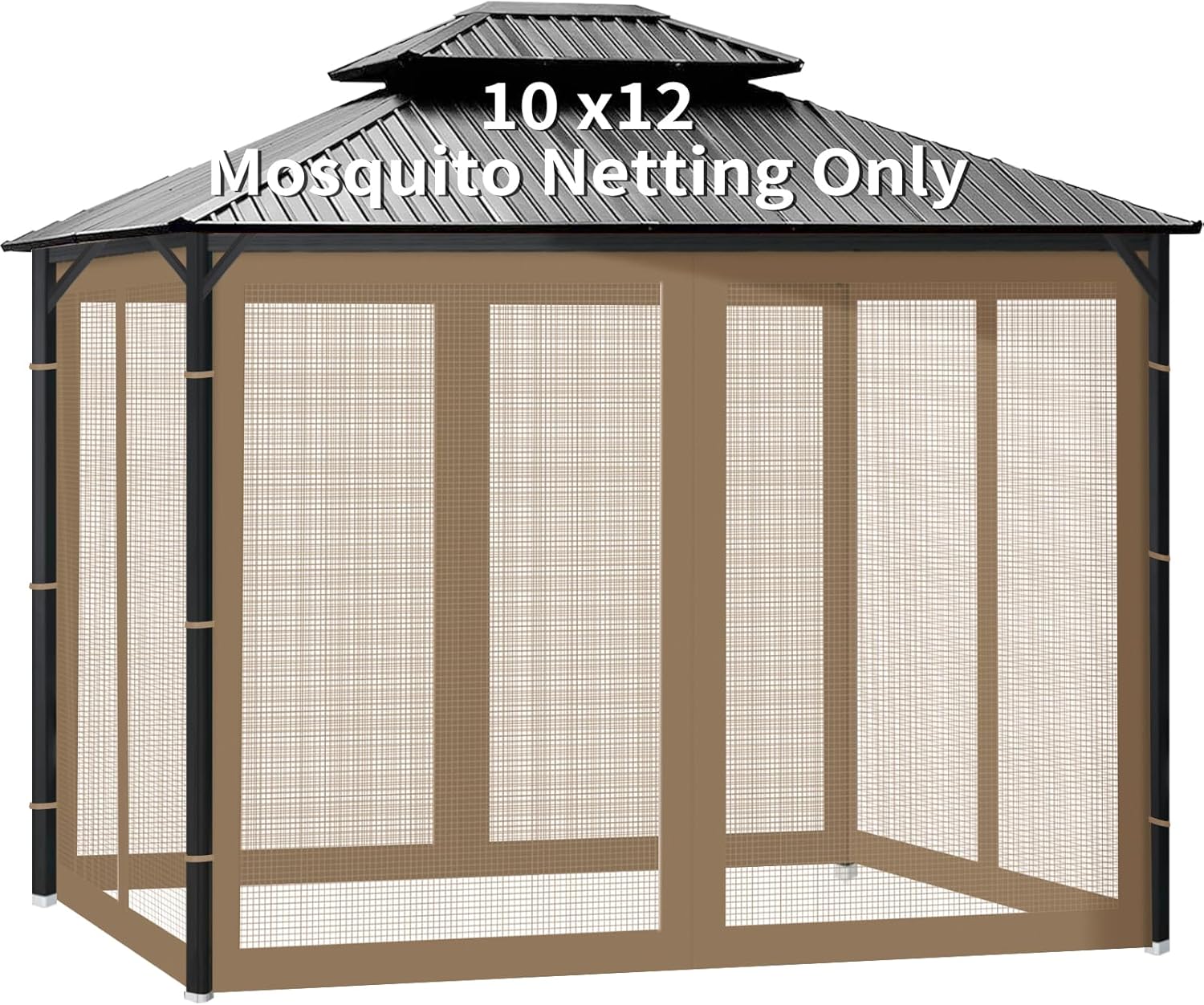 Gazebo Universal Replacement Mosquito Netting, 10' x 12' Outdoor Canopy Net Screen 4-Panel Sidewall gazebo curtains, with Zippers, Easy to Install, Fit for Most Gazebo 10x10 Canopy,Patio (Brown)