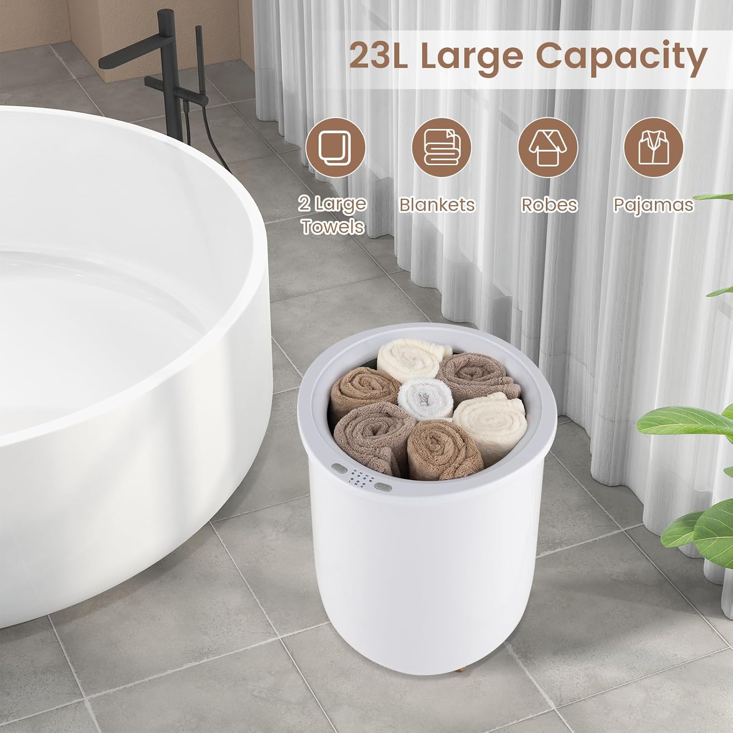 Product DescriptionDescription:Turn everyday to a spa day and enjoy comfort at home with this towel warmer bucket.This bucket style towel warmer can heat up in 1 minute and bring L/M/H heating temperature levels to offer you warm and comfortable clothes and towels. In addition, you can set the 20/40/60/90 mins timer according to your needs. With a large capacity of 23L, this towel warmer bucket easily holds a variety of clothes. Plus, it can be added with fragrance disc to offer you customized fragrance.Features:23L large capacity to hold various clothes and towels3 Temperature settings to perfectly different needs20/40/60/90 Mins timer settings bring convenienceFragrance holder to provide you with customized scentAuto shut off and overheat protection ensure securityBranch-shaped handle helps you easily remove the lidIndicator lights to show current settings clearlySpecifications:Color: White/Light Gray/White & BlackMaterial: PlasticProduct Dimension: 13.5" x 21" (Dia. x H)Rated Voltage: 120V ACFrequency: 60HzRated Power: 465WCapacity: 23 LPower Cord Length: 5.6 ftNet Weight: 6.5 lbsPackage Includes:1 x Towel Warmer Bucket1 x Instruction