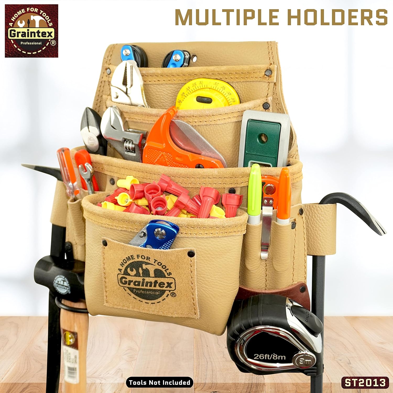 GRAINTEX DISTINCTIVE PRODUCTS are handmade by our highly expert skilled craftsmen using top quality beige color RUGGED genuine top grain leather, giving our customer the satisfaction with our product that can last much longer. The 10 Pocket Nail & Tool Pouch constructed with heavy duty genuine top grain leather that is extra soft and durable. Using the superior leather hides to prepare our exceptional line of top grain series. This specific series is treated with the top-notch quality of chemicals and oils for extra durability and strength. This exquisite tool pouch consists of ten pockets for extra convenience, the tool pouch comes with a 3” wide tunnel slots. Designed with one metal hammer holder, one measuring tape clip following with one large pocket that can hold multiple tools. One medium front pocket that can fit nails, medium-sized tools, two belt level inner pockets, and six small pockets for screwdrivers, pens, pencils, utility knife, and other miniature sets. The pockets are easily accessible, this tool pouch can be used in number of multiple other uses at the workplace or at home. With easily accessible pockets this tool pouch is a handy product for daily use. Accessories include a 3” wide belt tunnel slots for a 2.3/4” belt, one metal hammer holder fitting all standard sized hammers, and one standard sized measuring tape holder. This tool pouch can be used for multiple projects such as carpentry, housework, gardening, garage projects, electricians, construction, etc. This tool pouch is double stitched and reinforced with steel rivets for extra durability. Since finest heavy-duty genuine top grain leather has been used to manufacture this tool pouch, it will withstand the wear and tear of handy life, while still rustic and elegant in the process. This product will make an excellent gift for friends, family, and loved ones. At Graintex, we are confident that this product will last a long time. It will make a thoughtful, long lasting gift for anyone and everyone. All Graintex products are handmade using the finest materials for durable and long-lasting usage. All our products are comprised with black plated hardware and heavily double stitched at every stress point with reinforced rivets to provide the durability needed in the field. Every one of our products are uniquely originated with heavy duty materials for a sturdy finish for an easier accessibility, extra longevity, and a finer preference. All our products are designed and manufactured by highly professional experienced skilled craftsmen. Graintex Inc. is a family owned company founded in 2005 and has a manufacturing unit in India. Graintex products are professionally designed for use by professionals worldwide...