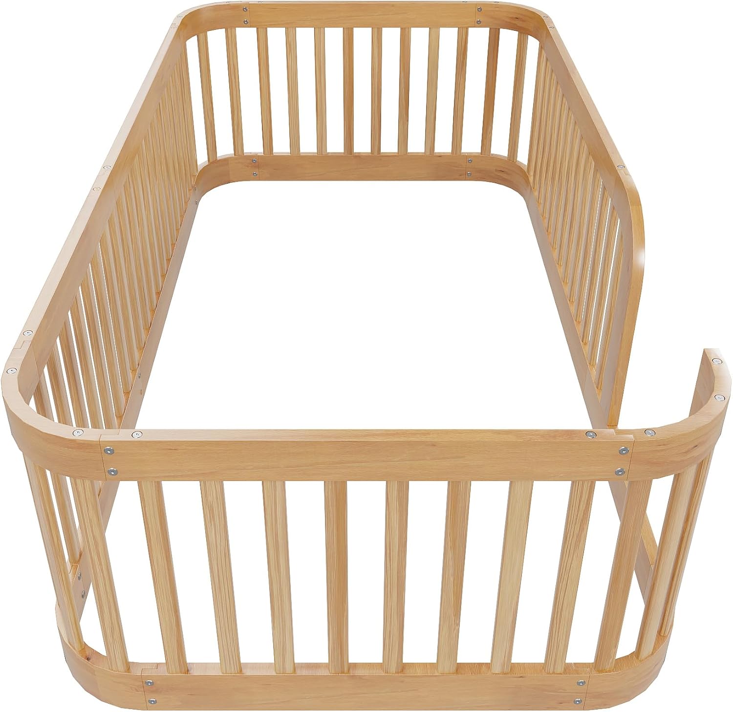 This floor bed frame is designed with a clean silhouette and a hue of elegance. Natural/White finish will suit all styles of home decoration, and completes the look of any kids bedroom. The rounded corners make the bed cute and safe. Description Material: Pine Wood+MDF Size: Twin Place of Origin: Viet Nam Color: White/Natural Numbers of Package: 1 Spring Box No need Assembly Required: Yes Dimensions: Overall Product Dimension: 77.75''L x 41.5''W x 23.8''H Twin Bed: 76'' x 39.8'' Total Height: 23.8'' Number of Bed Slats: 0 Recommend Mattress Thickness of Bed 8-10'' Overall Product Weight: 41lbs Bed Weight Capacity: No limit Notes: Manual measurement has been used,there may be some reasonable error.All the pictures are taken by actual samples, slight chromatic aberration may occur due to lighting or display.