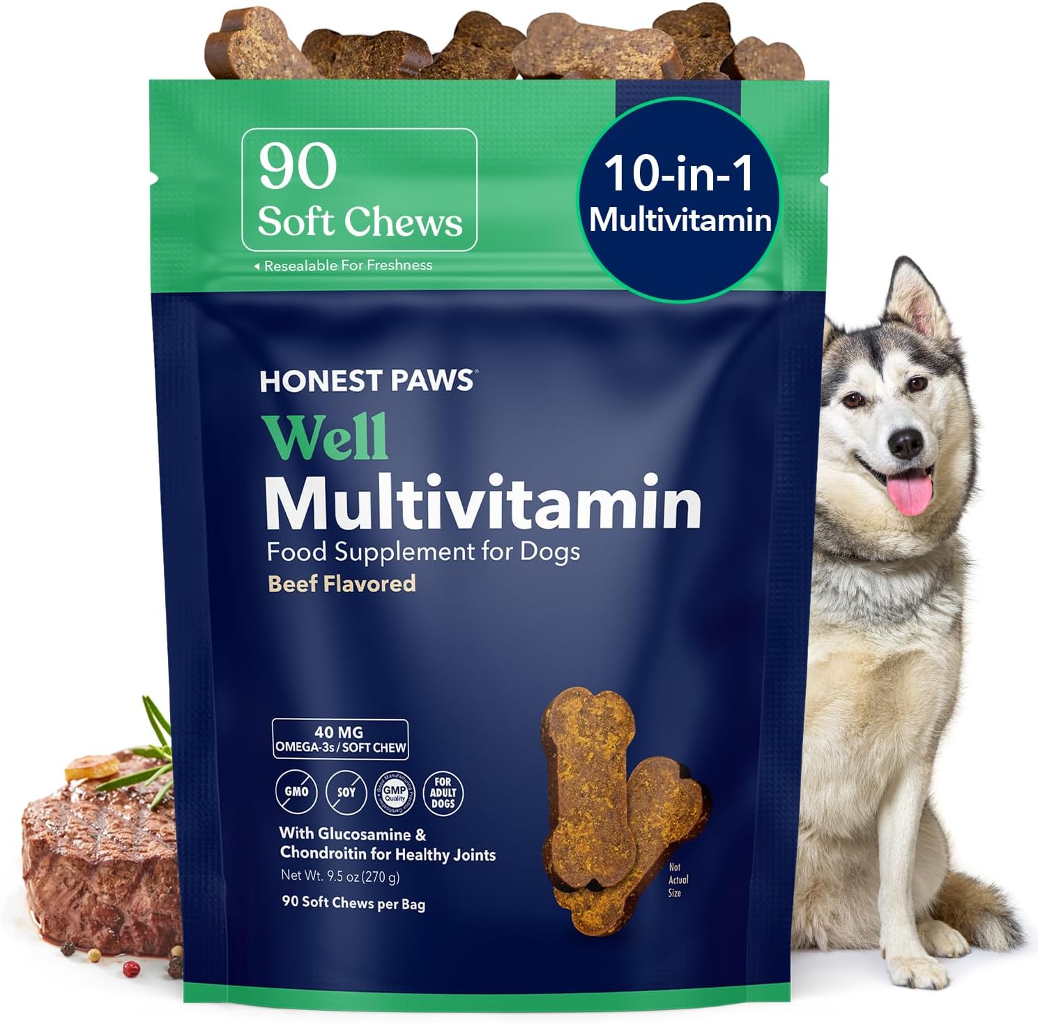 Honest Paws Multivitamin Chewable for Dogs - Elevating Nutritional Care for Your Dog. Set a higher standard in canine nutrition with Honest Paws Multivitamin. This carefully crafted soft chews target nutrient gaps in traditional dog food. We go beyond minimal requirements, tackling nuanced challenges often overlooked in typical dog food and multivitamins to ensure your furry friend's optimal health. Our formula is precise and meticulous, intentionally incorporating nutrients needed in larger quantities for optimal health, those dogs find challenging to absorb, and those where studies have indicated traditional dog food often falls short or lacks the nutrients entirely. This proactive approach surpasses industry standards to meet canine needs.