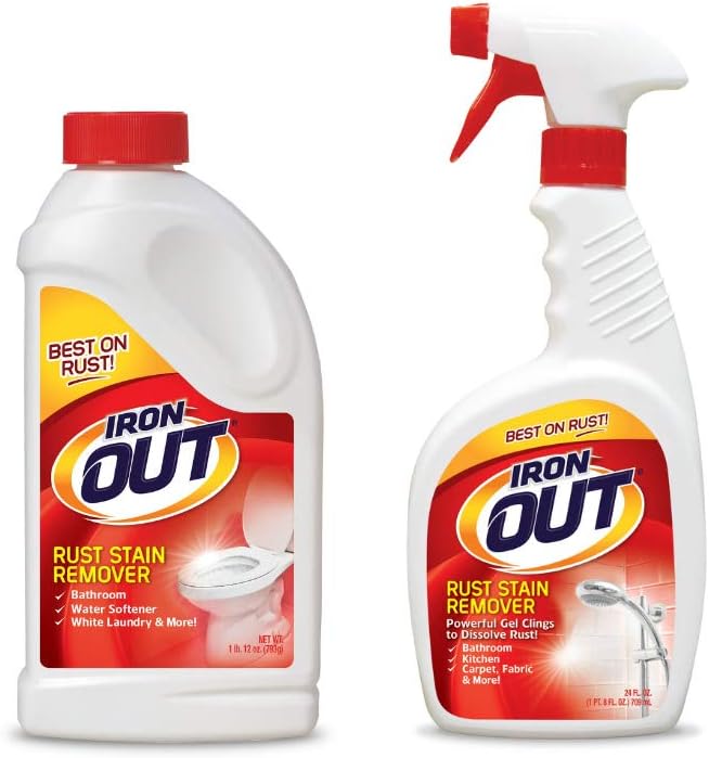 Iron OUT Automatic Toilet Bowl Cleaner is specifically designed to repel rust and hard water stains with every flush of your toilet. The concentrated, long-lasting formula cleans rust away and repels new stains from forming for up to 45 days per tablet. Iron OUT Spray is specifically formulated to cling as it dissolves the toughest rust stains on contact, no need for scrubbing. Ideal for use on vertical and hard-to-reach surfaces like showers, bathtubs, sinks, toilets above the water line, colorfast carpet, tile and many other surfaces. Iron OUT's heavy-duty rust stain remover powder is perfect for use in removing and preventing difficult rust stains in bathrooms, kitchens, appliances, laundry, water softener maintenance and many more applications in and around the home. Ideal for geographic regions with hard water and high iron.
