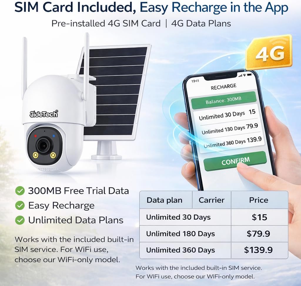 Designed for True Off-Grid Security JideTech Solar 4G AOV Camera is built for places without WiFi or power. Unlike PIR-based cameras that sleep most of the time, AOV technology keeps the camera online 24/7 with ultra-low power consumption. Why Choose AOV Over PIR? PIR detection distance: 8–10m AOV detection distance: longer & more accurate PIR records only when triggered AOV records continuously and switches to full frame when people appear Reliable Power, Reliable Connection With an 8W solar panel, 13500mAh battery, and built-in US-supported 4G SIM, this camera ensures stable performance anywhere. Recharge data directly in the app — simple and secure.