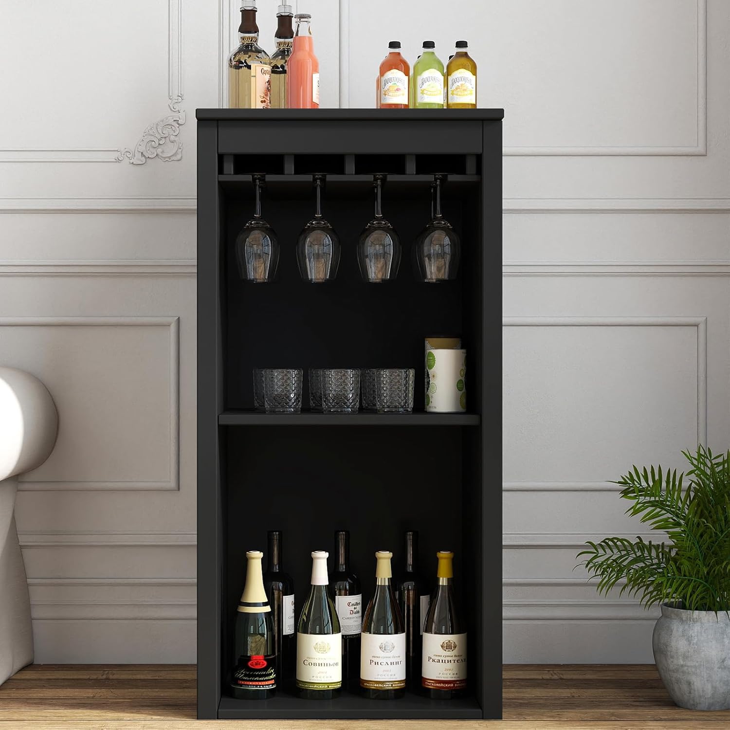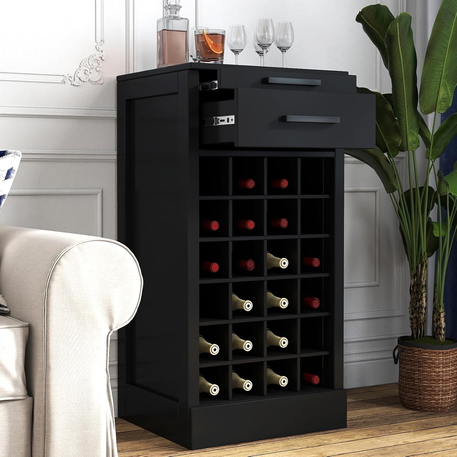 • All-in-One Home Wine Storage Solution: Your complete small bar! Combines ample liquor bottles storage with cabinet space for glassware or wine tools. Create a stylish home wine station instantly