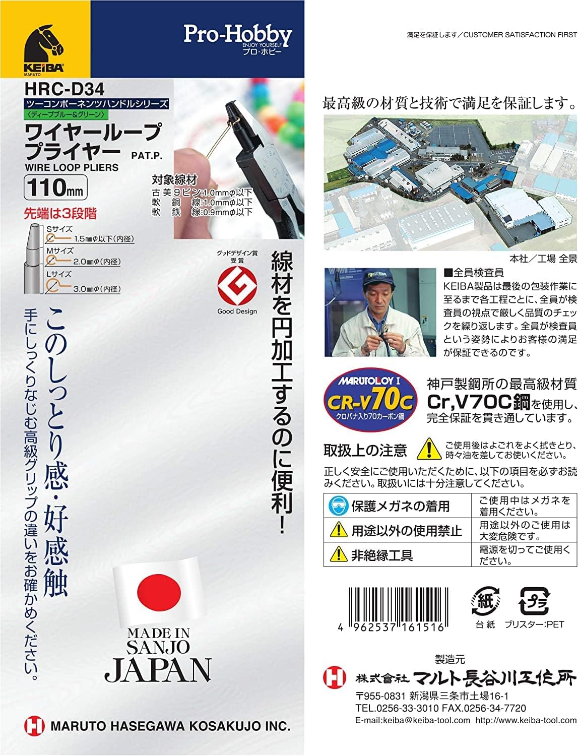[Uses] Pliers used for circular processing of wire material. [Functions / Features] Roll up the wire. Grips wires, etc. Rolls old beauty 9 pin φ1.0 or less. Round the soft copper wire: 0.04 inch (1.0 mm) or less. Rolls soft iron wire φ0.9 or less. [Specifications] Two-color molded grip. Spring included. 3 tipped tips. [Material] CR70 with chrome vanadium Product Size (W x H x D): 2.0 x 4.4 x 0.6 inches (50 x 112 x 15 mm); Weight: 2.5 oz (70 g); Product Code: 4962537161516; JAN Code: 4962537161516; Brand Name: Keiva; Product Name: Wire Loop Pliers; Standard: HRC-D34