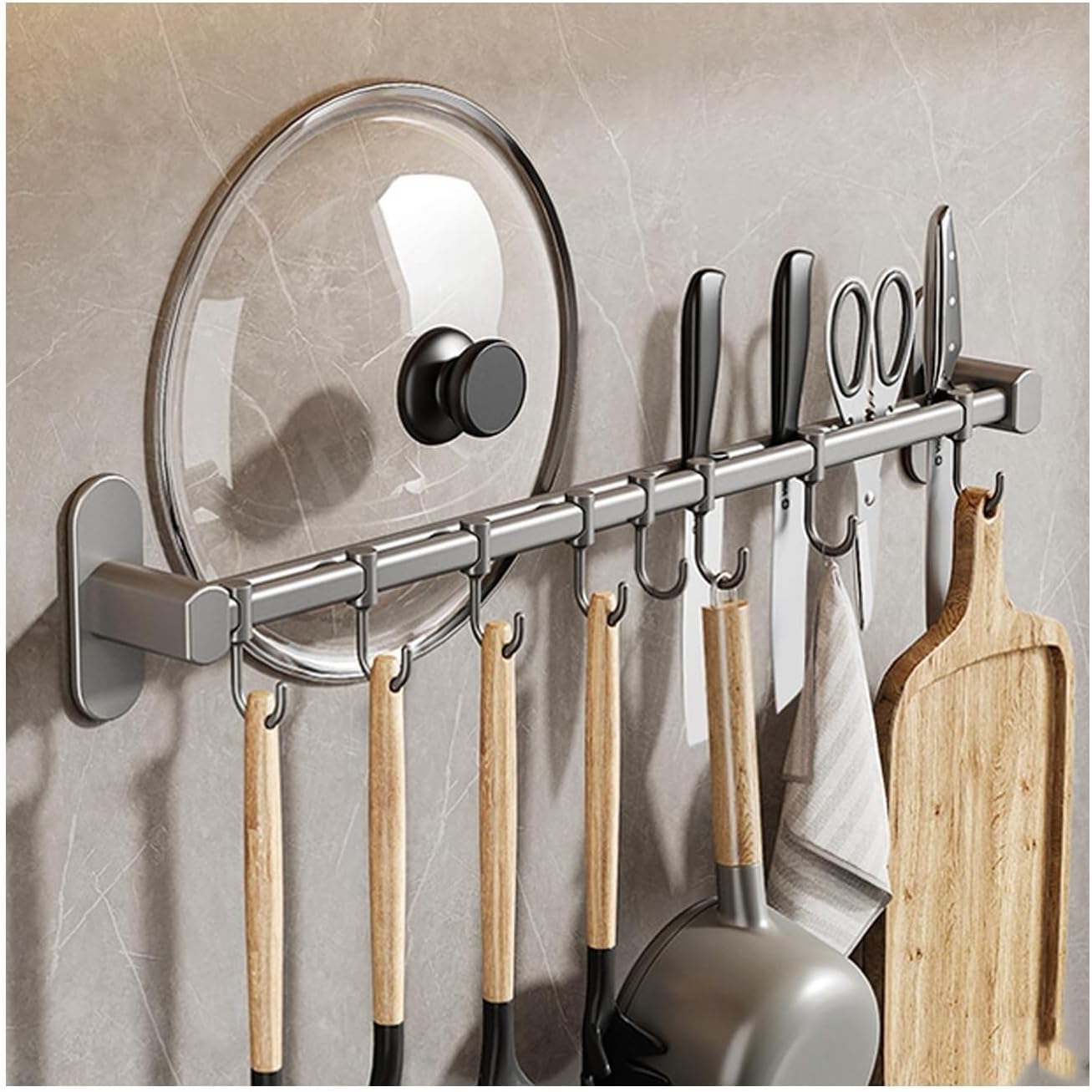 Rail Rack Organizer Self Adhesive Kitchen Utensil Rack Aluminum Wall Mounted Hanging Rail with Removable Hooks for Hanging Pots Pans Spoons KnivesProduct Details:-Thickened base, strong bearing, durable.-Open storage helps to air dry kitchen utensils.-Perfect for hanging kitchen utensils such as knives, cutting boards, spatulas, tea towels and more.Specification:Material:Stainless steelPackage Details:1 * Wall shelf for the kitchenMounting AccessoriesNote:-Please confirm the size before purchasing.-Due to the difference between different monitors, the picture may not reflect the actual color of the item.