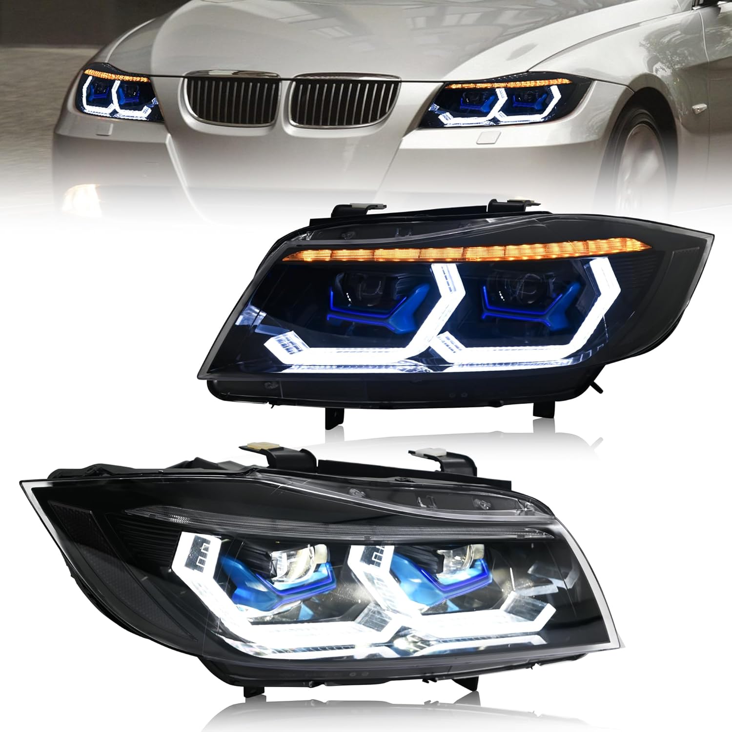 Fits for the following Vehicle: 3-Series Bimmer E90 E91 320i, 325i, 325Xi, 330i, 330Xi, 318d, 320Si,335d, 328i, 328Xi, 335i, 335Xi 2009 2010 2011 2012. Only Fit Factory Halogen Models! Specifications: Waterproof: IP67. Bulb: Full LED. Operating voltage: 12V 35W. Functions: Led Amber Turn Signal, Multicolor Drl, High and Low Beams. Housing Color: Black. Lens Color: Clear. Housing Material: ABS plastic. Lens Material: PC.Package included: Comes with complete set of headlights(driver and passenger sides), Daytime Running Light Adapters and one User Manual.