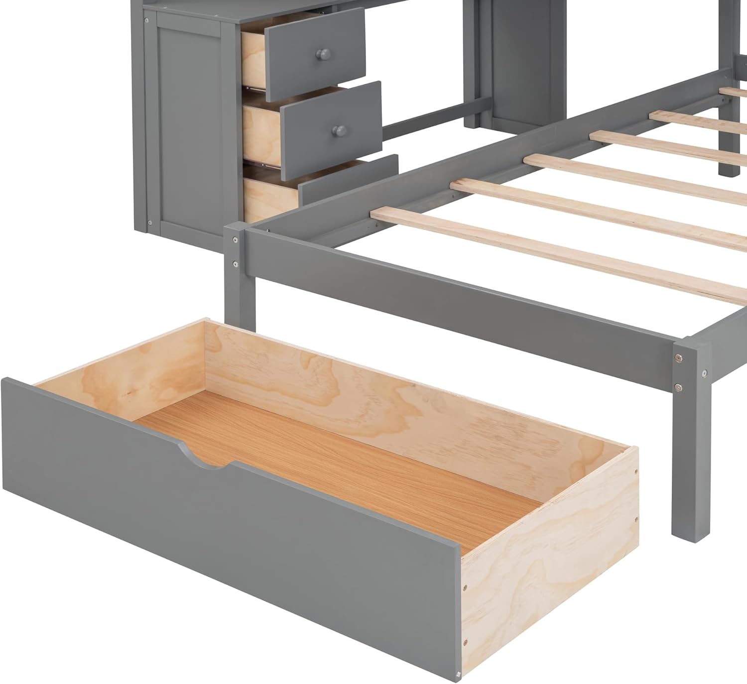 Full Over Twin Bunk Bed with Stairs, Storage Drawers, Full Size Loft Bed Frame with Desk and Shelves With a full-size bed on the top bunk and a twin-size bed below, this bunk bed offers flexible sleeping options for siblings, guests, or sleepovers, ensuring everyone gets a comfortable night's rest, designed to maximize space and functionality in any bedroom! Transform bedtime into study time effortlessly! This bunk bed comes equipped with a sleek desk, ideal for homework sessions, crafting, or remote work. Plus, with three additional drawers, keeping study essentials organized has never been easier. Weight & Dimensions Overall Product Dimension: 97.9"L x 80"W x 64.6"H Number of Package: 3 Overall Product Weight: 306.07LBS Weight Capacity: Upper bed: 600LBS Bottom bed: 400LBS Recommended Mattress Thickness: Upper bed: 6" Bottom bed: 6" Recommended age : > 6 years old Specifications Product Type: Bunk Bed Size: Full-Over-Twin Color: Gray/White Material: Plywood+MDF+Pinewood Number of Slats: Upper bed: 14 Bottom bed: 7 Country of Origin: Vietnam