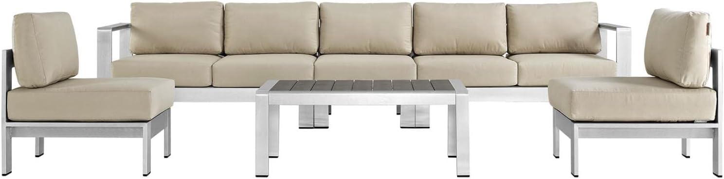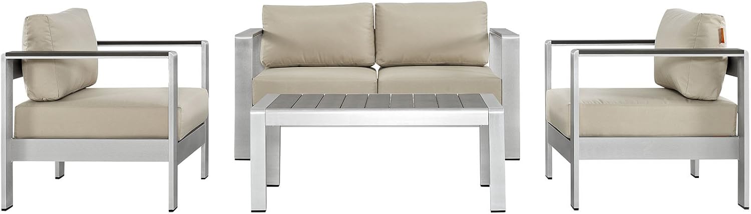 | Additional Features | Finish: Silver, navy, Includes: One - Shore Coffee Table, One - Shore Left-Arm Corner Sectional Loveseat, One - Shore Right-Arm Loveseat, Two - Shore Armless Chair, Materials: Fabric, anodized aluminum |