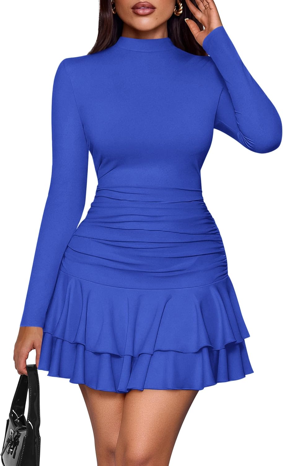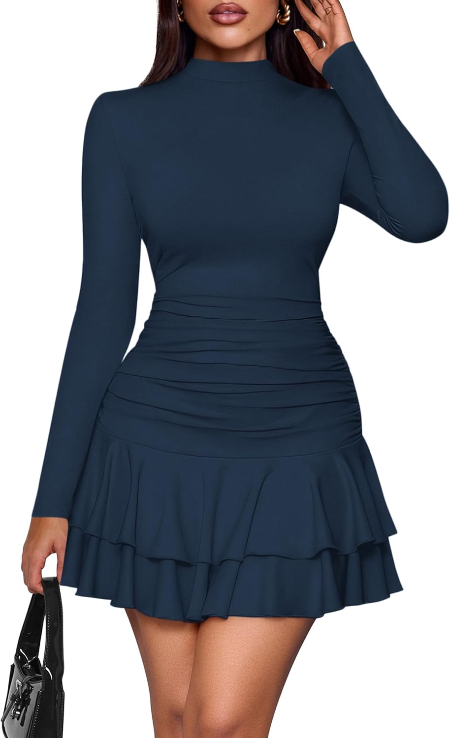PRETTYGARDEN Womens Spring Long Sleeve Dresses 2026 Mock Neck Ruched Y2K Clothes Ruffle Layered Bodycon Mini Party Dress