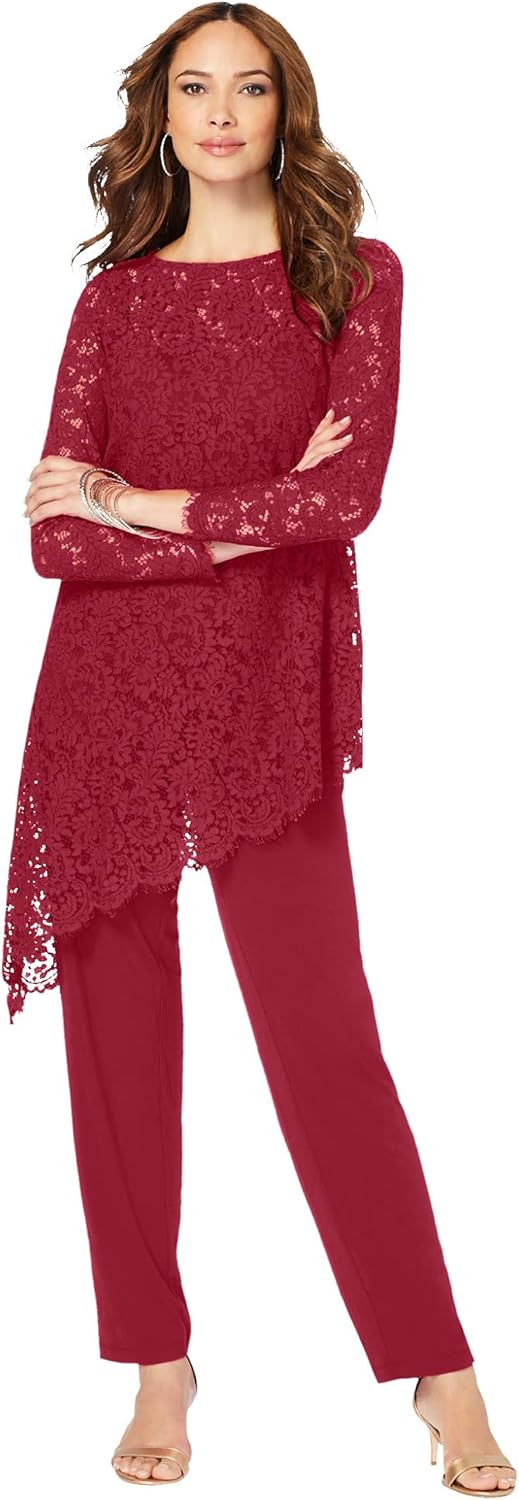 | Style | Plus-size Asymmetrical Lace Pant Set –long Sleeve Lace Scalloped Tunic & Elastic Waist Pants |