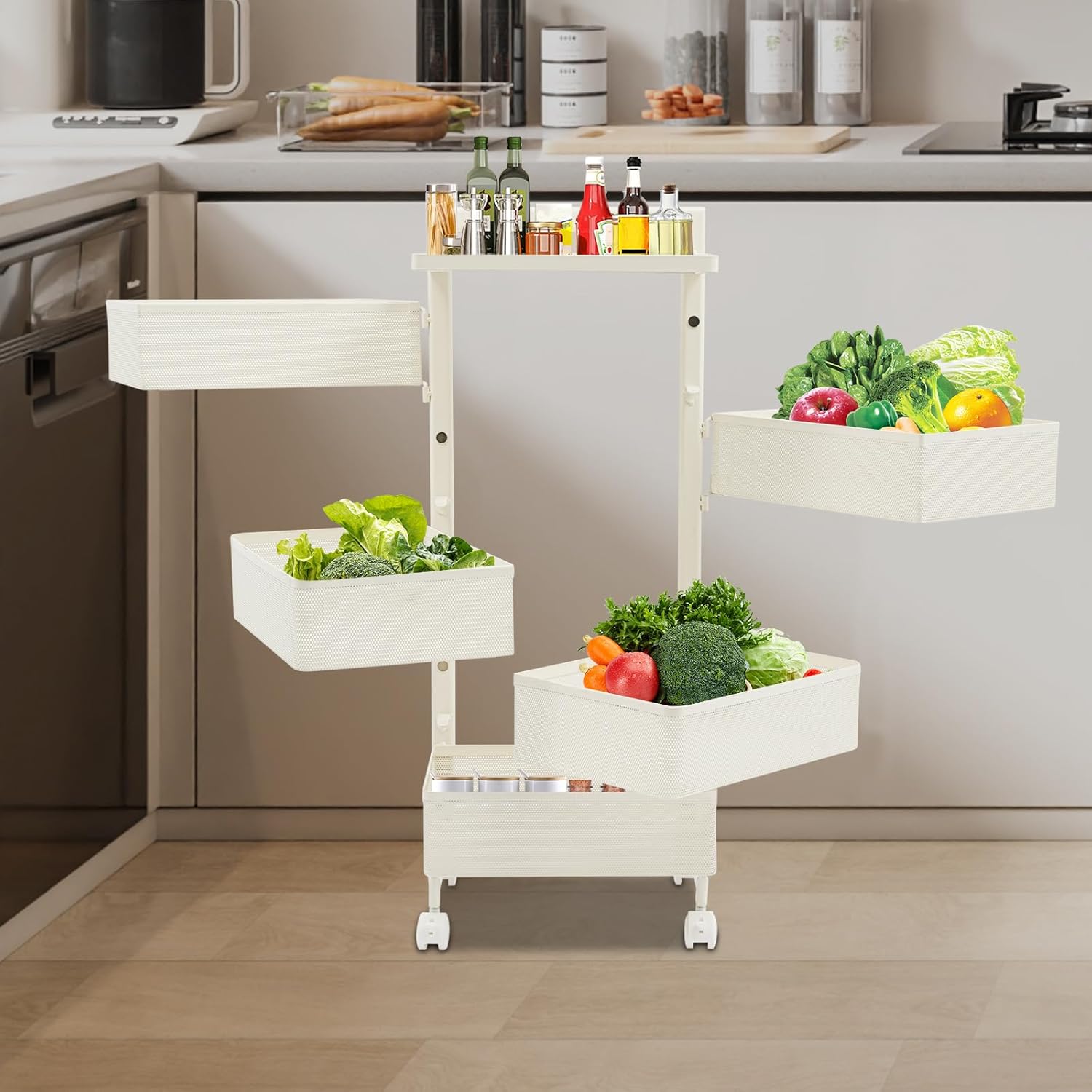 DescriptionThis rotating kitchen storage rack, with its ingenious design and outstanding functionality, not only maximizes limited kitchen space but also provides designated storage for various spice jars and even fruits/vegetables, making it an ideal kitchen storage helper. It has flexible wheels, a large capacity, and is easy to clean, making it a multifunctional storage rack.DetailsComfortable Handle: The thickened top handle offers a comfortable grip for great pushing.Smooth Edges: They can protect your hands from getting scratched during daily use.ApplicationThis product is suitable for use in kitchens, bathrooms, bedrooms, living rooms, and laundry areas, and can store items such as spice jars, toiletries, vegetables, snacks, groceries, corn, potatoes, onions, and more.SpecificationsMaterial: Carbon SteelProcess: Baked PaintColor: Green+White/WhiteAssembly Required: YesMounting Type: FreestandingNumber of Universal Wheels: 4(2 with Brakes)Top Platform Edge Height: 2cm/0.79inTier Spacing: 4.5cm/1.77inEach Wheel Height: 5cm/1.97inEach Basket Size: 35*25*10.5cm/13.78*9.84*4.13inProduct Size: 35*26.2*87.5cm/13.78*10.31*34.45inPackage Size: 86.5*37.5*27.5cm/34.06*14.76*10.83inGross Weight: 8.15kg/17.97 lbsNet Weight: 6.85kg/15.1 lbsPackage Included1*Rotating Kitchen Storage Rack4*WheelsNotes1. Please check the product size before ordering to make sure it fits your needs.2. Please allow the slight color difference caused by the shooting light and 1-3cm error due to manual measurement, and make sure you do not mind before you order.