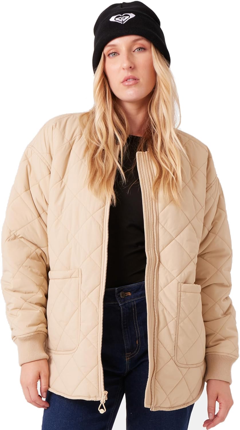 The ROXY Women’s Aurora Quilted Sherpa-Lined Bomber brings cozy comfort and relaxed street style into one go-anywhere outerwear essential. Built with a crinkle nylon shell and lined in soft faux sherpa, this PFAS-free bomber offers breathable warmth and a modern oversized fit. The rib-knit cuffs and hem ensure a snug seal, while the shirt-tail hemline adds shape and coverage. Insulated with lightweight polyfill and equipped with double-entry patch pockets, this jacket is made for casual cold-weather layering—from urban mornings to après-ski lounging. Style it with leggings, denim, or joggers for everyday winter versatility.