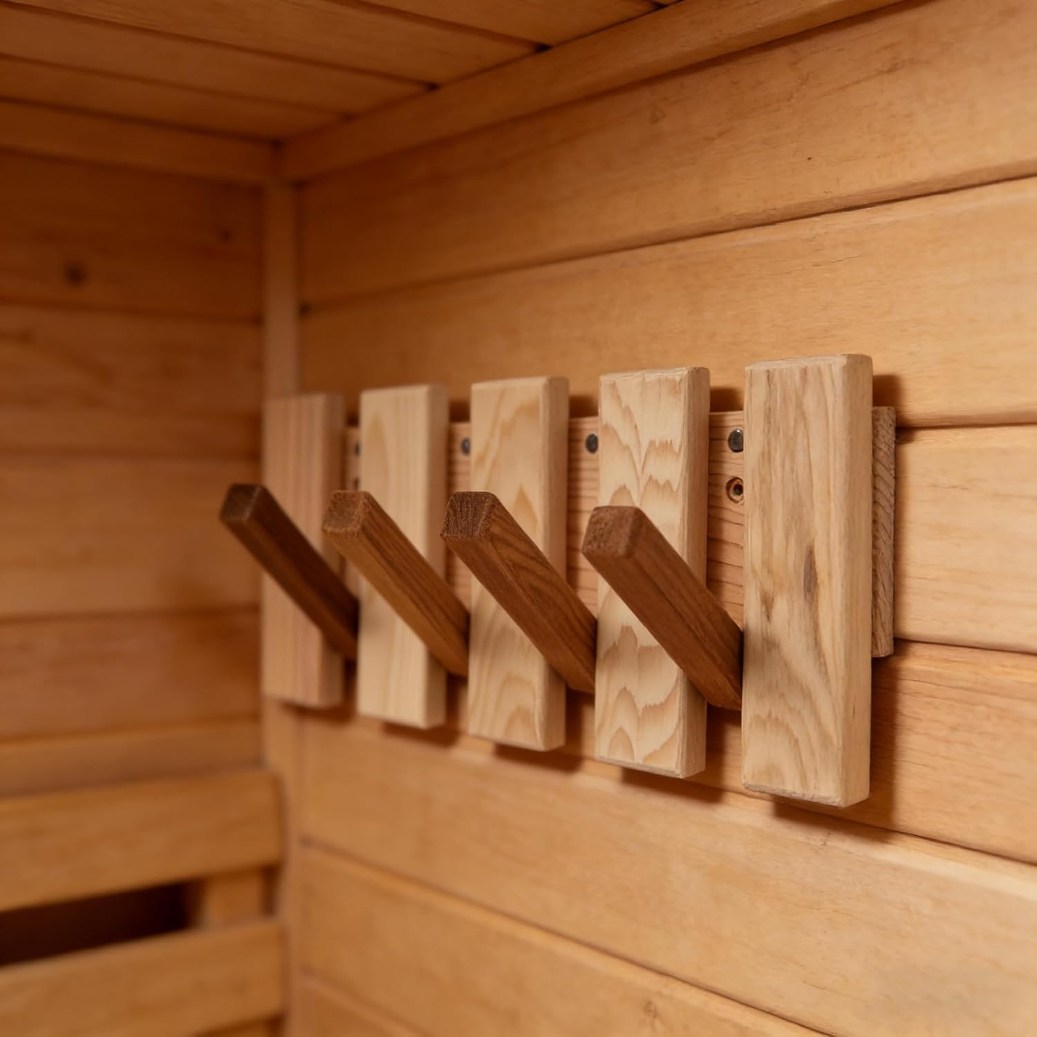 Upgrade your sauna with the Cedar Towel Rack - a blend of elegance and practicality. Crafted from top-tier red cedar, this wall-mounted unit thrives in warm, humid sauna conditions, boasting exceptional durability. Its compact, streamlined design saves space while keeping towels, robes, and clothes within easy reach for fast drying. Free of harmful chemicals, it adds natural cedar grain charm and a subtle, pleasant aroma, keeping your sauna clean, healthy, and organized. Simple to install and built to last, it’s a must-have sauna accessory for style and function.