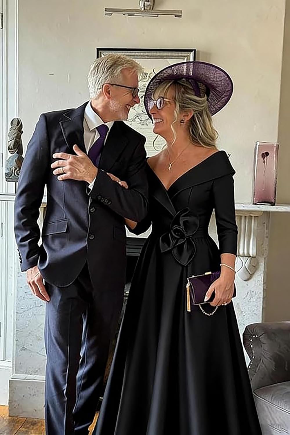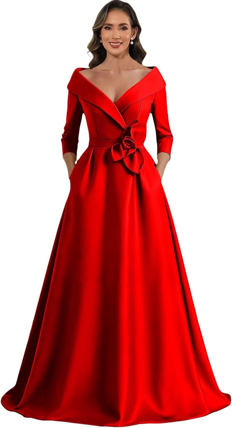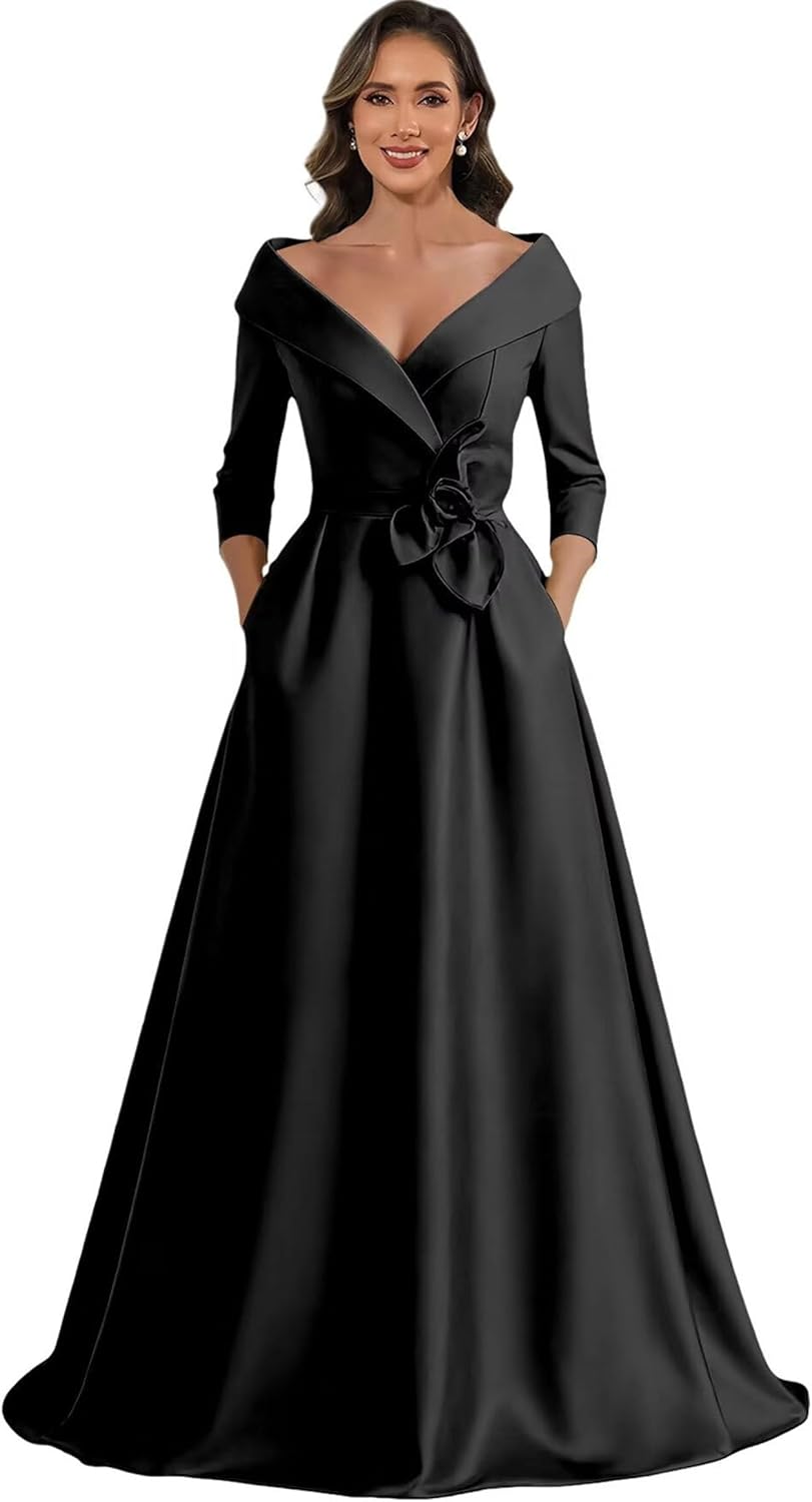 The off-shoulder design features a dramatic portrait collar that beautifully frames the neckline and shoulders, creating a graceful silhouette. The three-quarter length sleeves offer modest coverage while maintaining an air of refinement. A distinctive bow detail at the waist adds a touch of feminine charm and helps define your figure, while the A-line skirt flows gracefully to the floor in a flattering cut that suits various body types.The dress features convenient side pockets, seamlessly integrated into the design for both practicality and style.