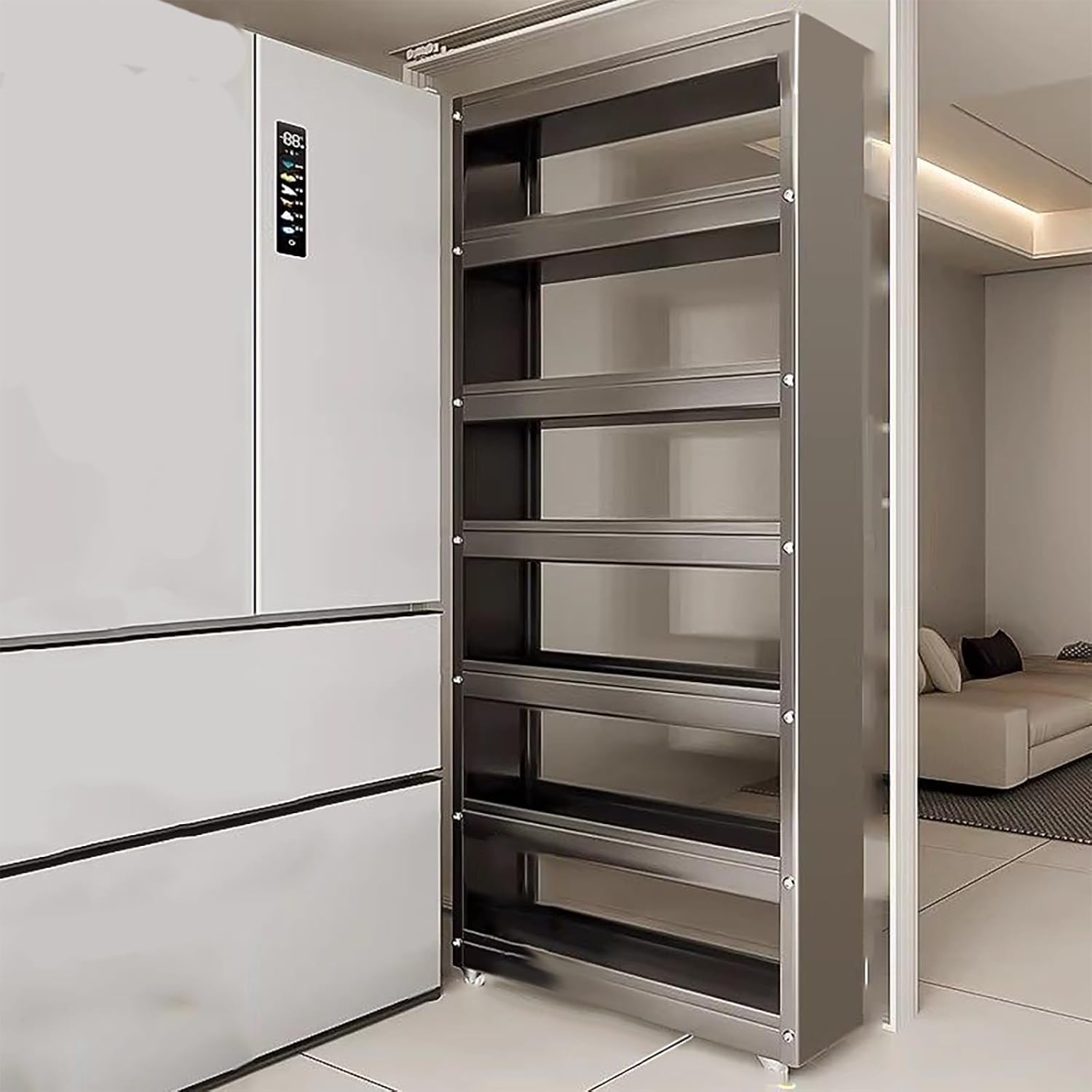• Multi‑Tier Vertical Storage: The thoughtfully spaced shelves provide generous room for spices, bottles, cleaning products, and miscellaneous items. Each level has guide rails to help keep items orderly, enhancing your kitchen storage solution, space saver cart, and tiered shelving organizer experience