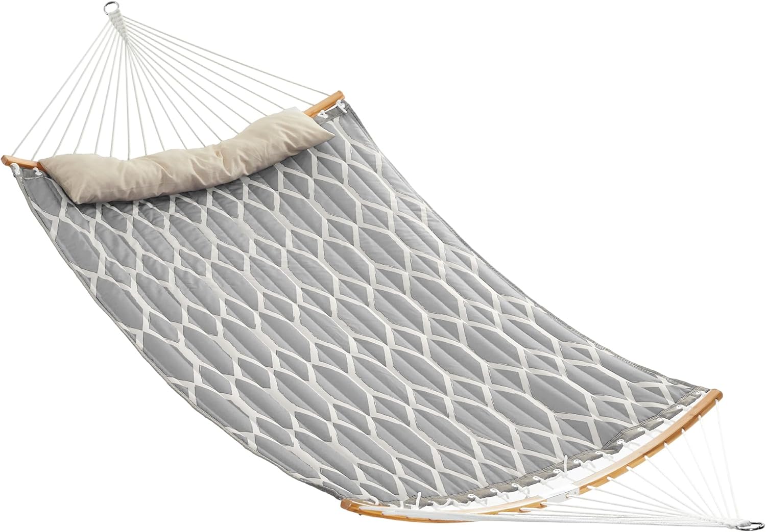 The Highlights of This Hammock at a Glance: - Safe and stable: Curved bamboo spreader bars prevent tipping for safer and more stable use. - For 2 people: The 78.7''L x 55.1''W space and 495 lb load capacity allow you to share it with your loved ones. - Comfortable: Made of 300D thick polyester fabric with soft padding, and equipped with a pillow. - Easy to store and carry: When folded, it's compact and is easy to carry. - Easy assembly: Thanks to the simple structure, the hammock is easy to assemble. Specifications: - Color: Cream, Beige - Material: Polyester Fabric, Polyester Padding, Bamboo - Product Size: 78.7''L x 55.1''W (200 x 140 cm) - Total Length of Hammock: 131.9'' (335 cm) - Product Weight: 12 lb (5.5 kg) - Max. Static Load Capacity: 495 lb (225 kg) Package Contents: - 1 x Hammock - 1 x Pillow - 1 x Instructions SONGMICS Notes: - Different monitors may cause a slight color variation in the images displayed. - The size is obtained by manual measurement, so there may be an error within 2". - There are no straps and carabiners included with this hammock.