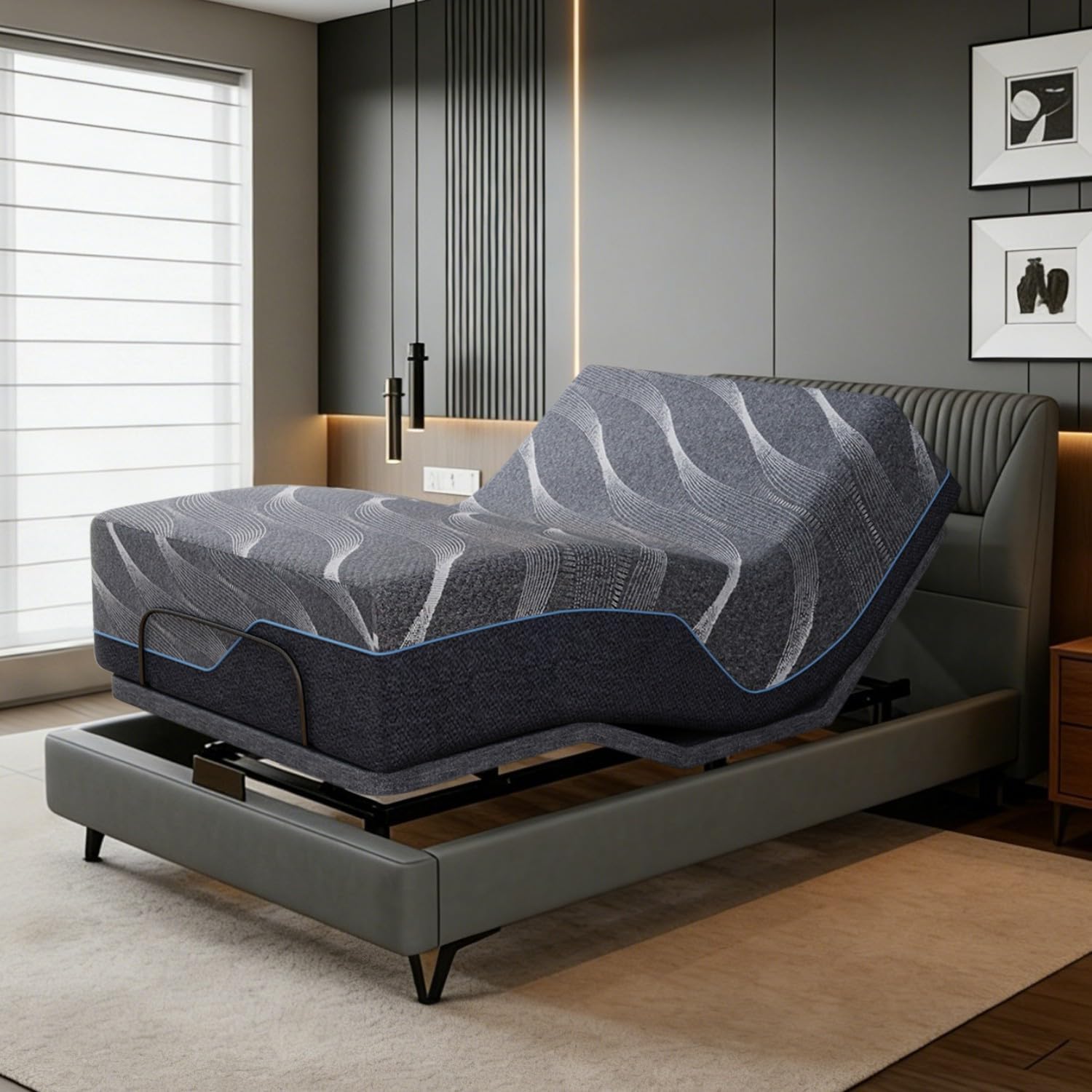 • 【Comfort Adjustable Bed Frame 】This electric bed frame lets you fine-tune your position with, 65° back tilt, and 45° leg tilt. Whether you're reading or kicking back in a zero-gravity position that takes pressure off your spine. You can save your favorite positions as memory presets—like TV mode, the anti-snore, or any custom angle you love—and switch between them with just one tap. The adjustable base gives you total control to shift positions by using the wireless remote.