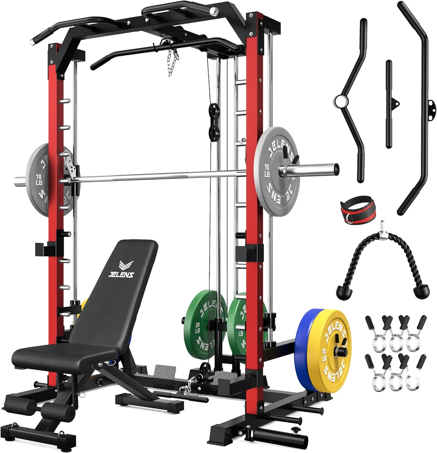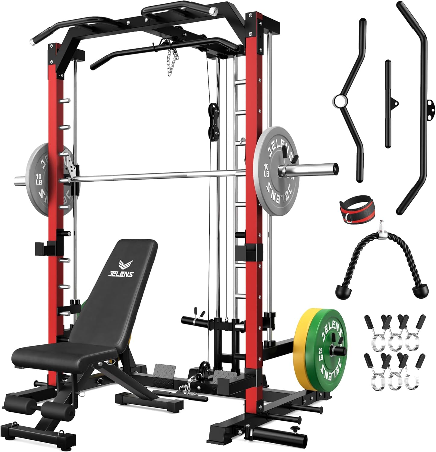 JELENS SR01 Smith Machine, 2000LBS Multi-Function Power Cage with LAT Pulldown System, All-in-One Home Gym Squat Rack with Smith Bar and Training Attachments for Full Body Workouts